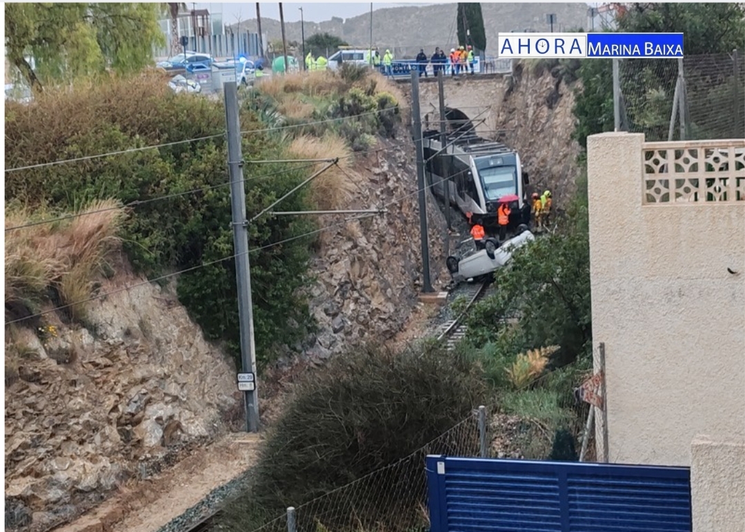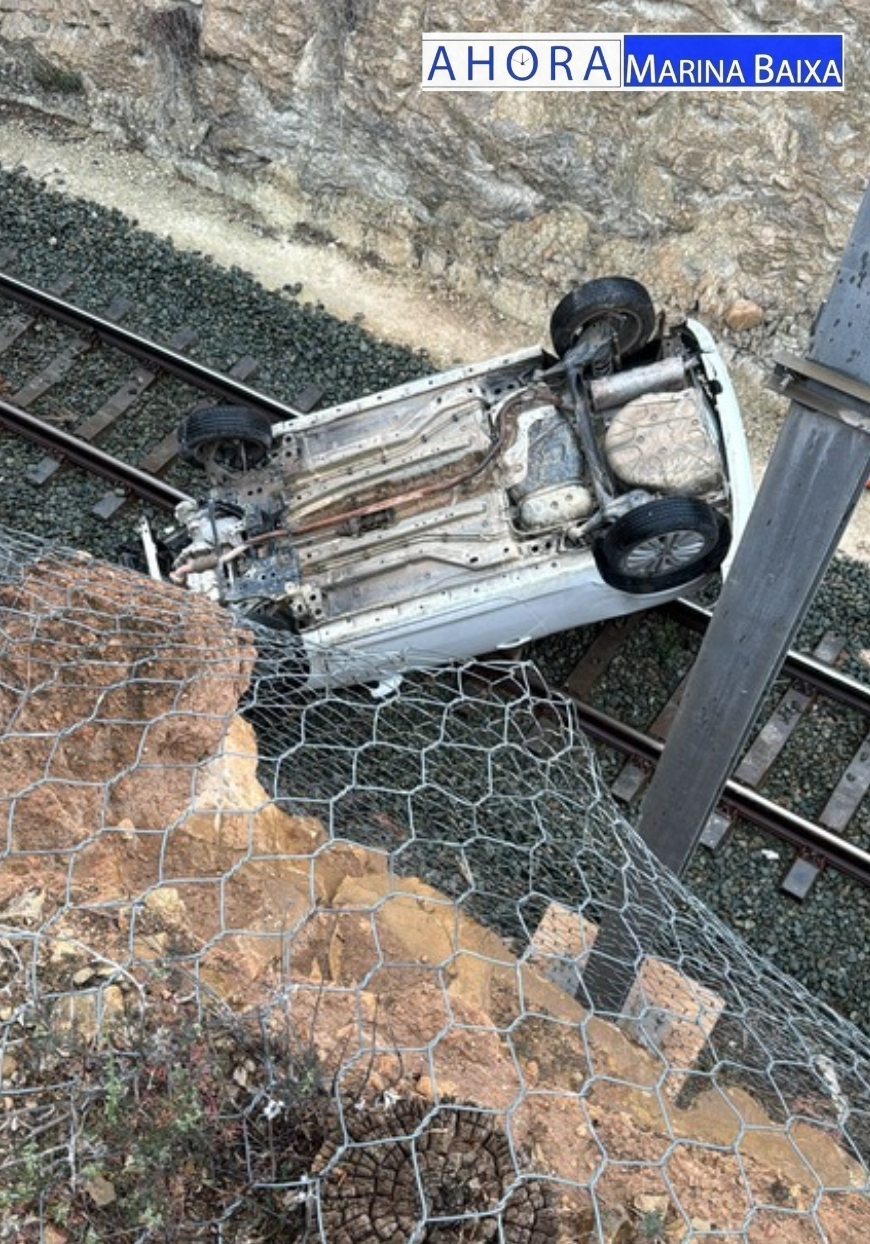 El suceso se ha producido en la mañana de este jueves cuando el turismo, por causas que se investigan, ha terminado precipitándose al tramo ferroviario por el que circula el TRAM que conecta Benidorm y Villajoyosa.