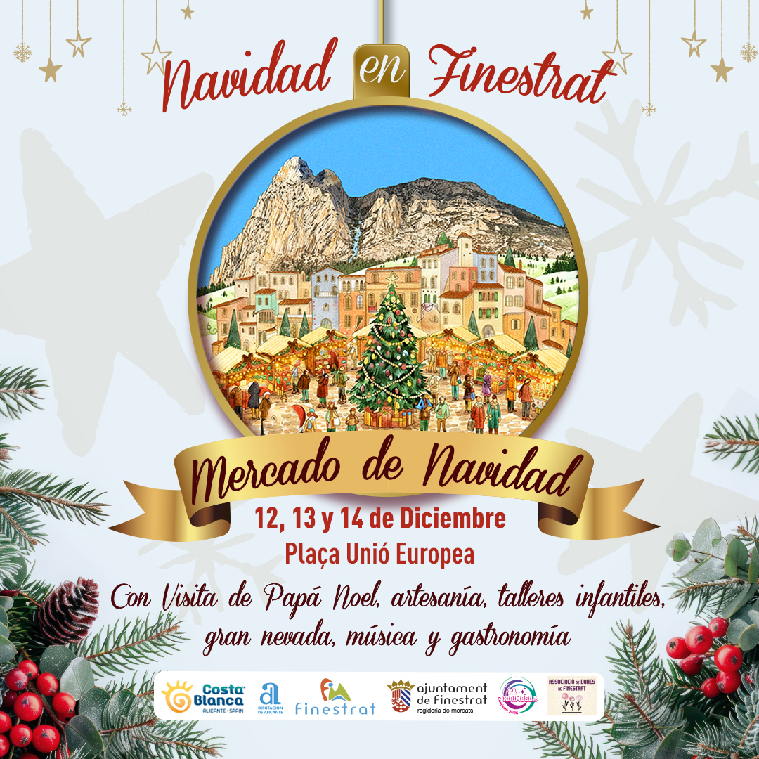 Uno de los platos fuertes de la Navidad en Finestrat es el Mercado Navideño que arranca el viernes día 12 a las 18:00 h y que permanecerá abierto hasta el domingo 14 por la tarde. Paradas de navidad y artesanales, música en directo, cuentacuentos, visita de Papá Noel y los jugueteros, villancicos, canciones de Navidad con toques pop-rock, circo, magia, humor… Una oferta familiar que nadie debería perderse y en la que participan agrupaciones locales como l’Associació de Dones de Finestrat, la Comissió de Festes La Xirimbela, los centros educativos o Cáritas Finestrat.