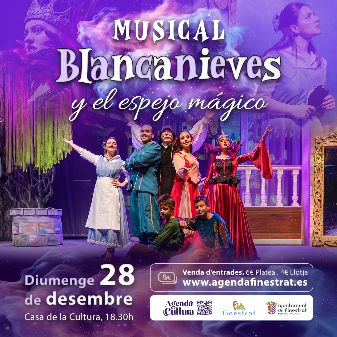 La navidad en casa y en familia porque el domingo 28 a las 18:30 horas llega otra de nuestras grandes ofertas culturales: El musical “Blancanieves y el espejo mágico” a cargo de la compañía Taules Teatre. Un espectáculo para toda la familia inspirado en este clásico cuento, aunque con novedosos elementos en la historia como el poder de Maléfica de traer personajes de otros cuentos para ayudarla en su equivocada búsqueda de la belleza exterior. Las entradas ya se pueden adquirir en agendafinestrat.es. Precio: 6€ y 4€ (palco).
