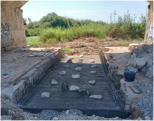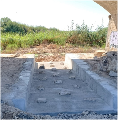 La adaptación de este obstáculo es uno de los objetivos contemplados en el Proyecto. Durante el mes de mayo se ha llevado a cabo la excavación de la estructura y la construcción de una rampa de hormigón de poca pendiente y con piedras incrustadas para facilitar el movimiento de la fauna.