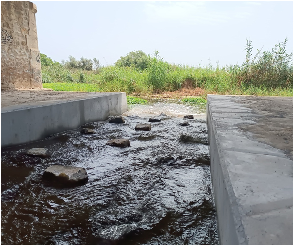 Como ha indicado también, además, se ha ejecutado una rampa para peces en el puente de la carretera N-332. La estructura de la base del puente genera un salto de agua de 1 metro, lo que supone una barrera transversal para la fauna del río Algar, impidiendo o dificultando el libre desplazamiento río arriba.