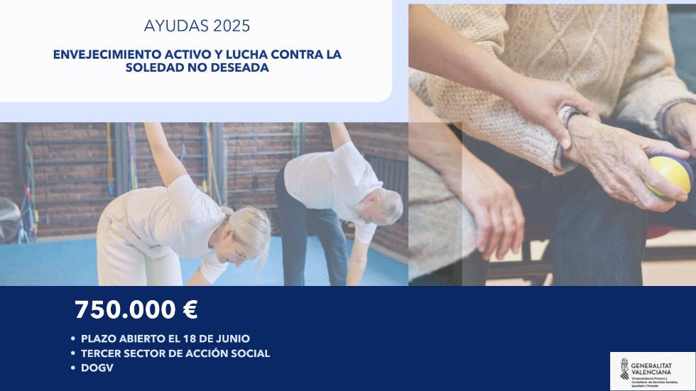 La Generalitat ha convocado las subvenciones de 2025 para programas de envejecimiento activo y lucha contra la soledad no deseada, financiados a través de la Vicepresidencia Primera y Conselleria de Servicios Sociales, Igualdad y Vivienda.