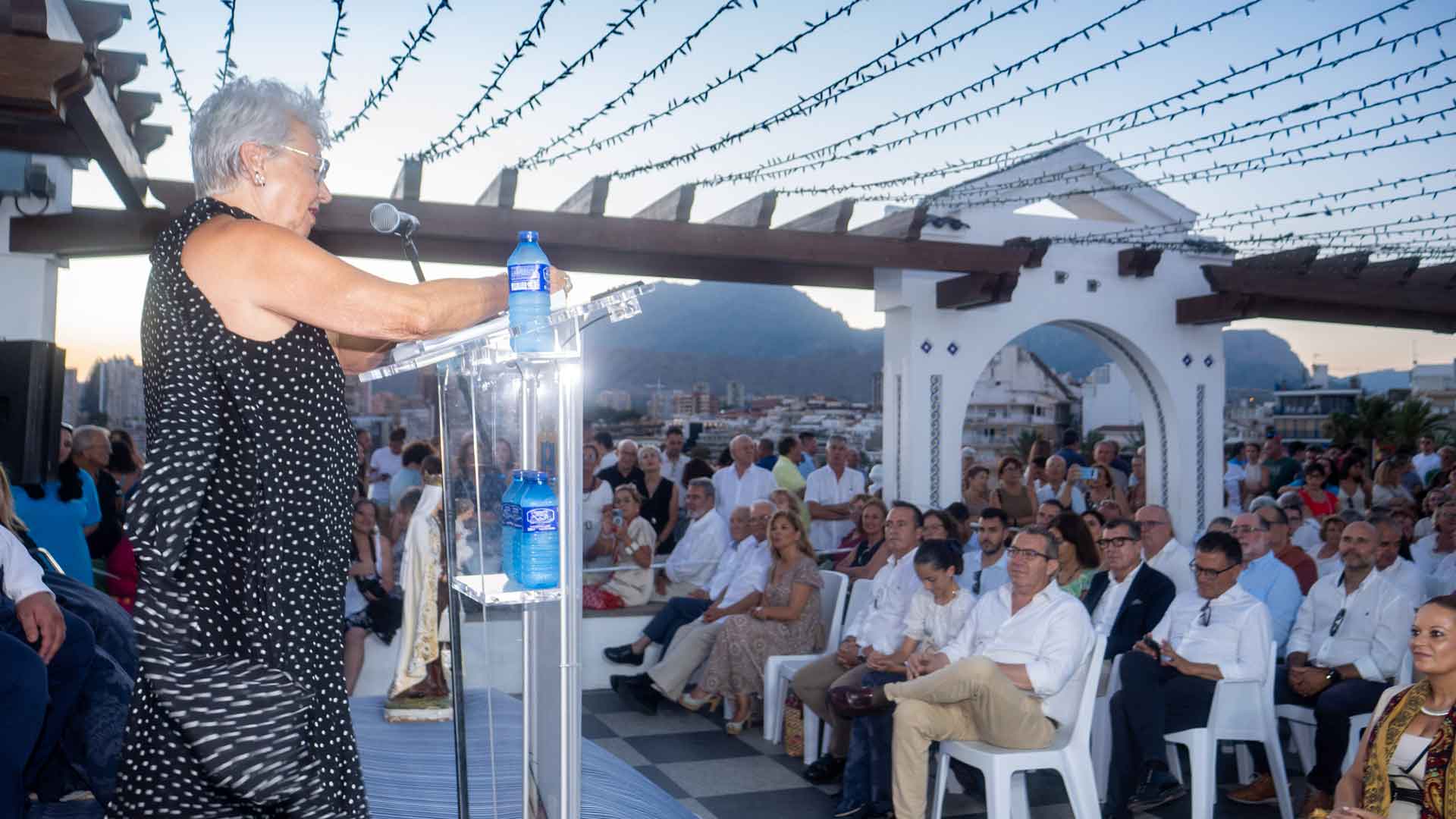 Finalizada la misa, la celebración continuó en el Castell con el pregón oficial, a cargo de Vicenta Asensio, quien destacó en su intervención las profundas raíces marineras de Benidorm, ciudad de pescadores, almadraberos y marinos mercantes. La pregonera animó tanto a vecinos como a visitantes a disfrutar de una de las fiestas más representativas y arraigadas en el sentir del pueblo.