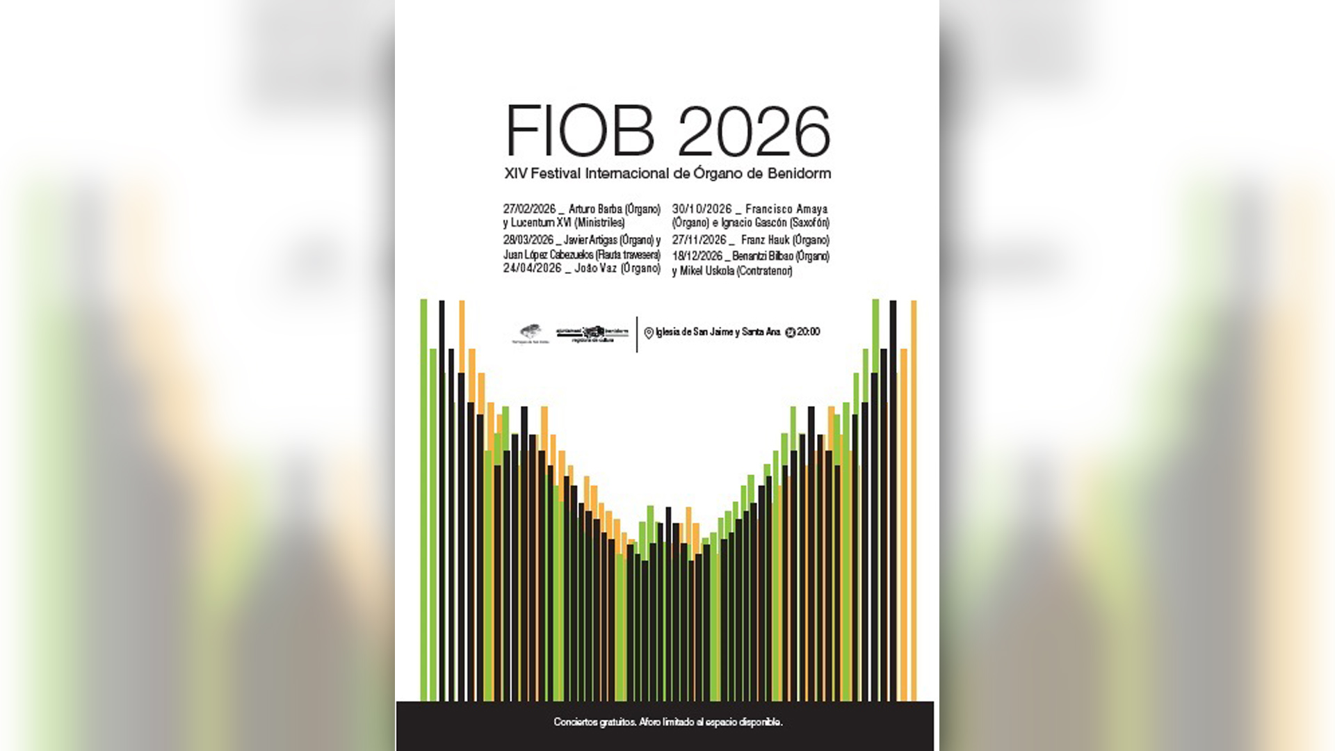 Como ya se ha apuntado anteriormente, el Festival Internacional de Órgano de Benidorm 2026 se iniciará este viernes, 27 de febrero, con el concierto que ofrecerán Arturo Barba (Órgano) y Lucentum XVI (Ministriles). La siguiente cita será el 28 de marzo, el único día que los conciertos cambian de viernes a sábado, y estará protagonizada por Javier Artigas (Órgano) y Juan López Cabezuelos (Flauta travesera).