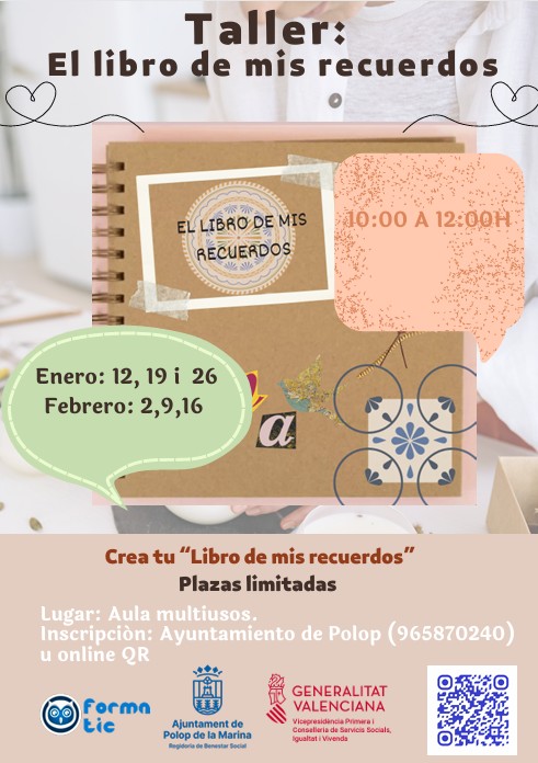 De forma paralela, la concejalía ha puesto en marcha el taller ‘El libro de mis recuerdos’, una nueva propuesta destinada a fomentar la memoria, la creatividad y el bienestar personal. Tras una primera sesión celebrada esta semana, el taller se desarrollará cada lunes hasta el 16 de febrero, de 10:00 a 12:00 horas, en el aula multiusos. Se trata de un espacio en el que las personas participantes podrán crear su propio libro de recuerdos y compartir un tiempo enriquecedor en grupo. Las plazas son limitadas y la inscripción puede realizarse llamando al Ayuntamiento de Polop de la Marina (965 870 240) o mediante el código QR habilitado en el cartel informativo.