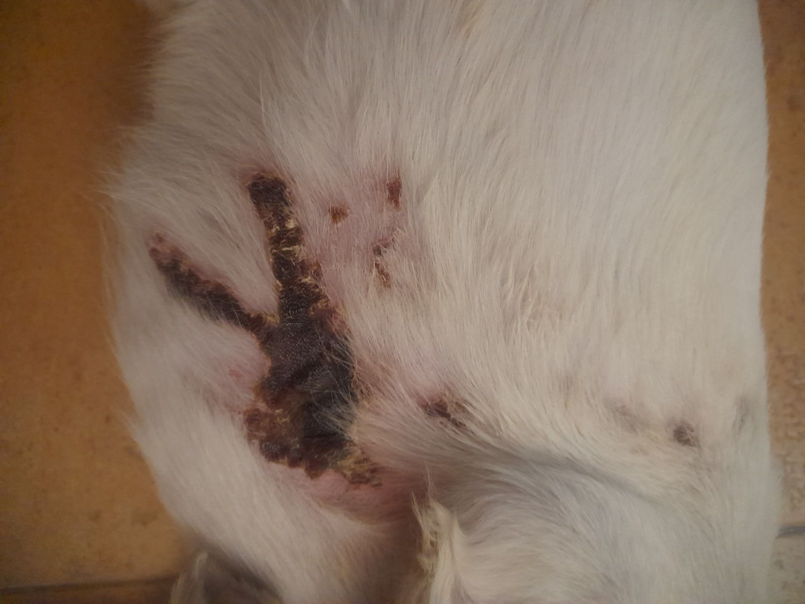 La propietaria detectó varios episodios de ladridos intensos seguidos de quejidos de dolor. Al salir a la terraza encontró al perro con la oreja mojada, el ojo afectado y parte del cuerpo cubierto por un líquido amarillento. El informe veterinario confirmó lesiones compatibles con quemaduras químicas.