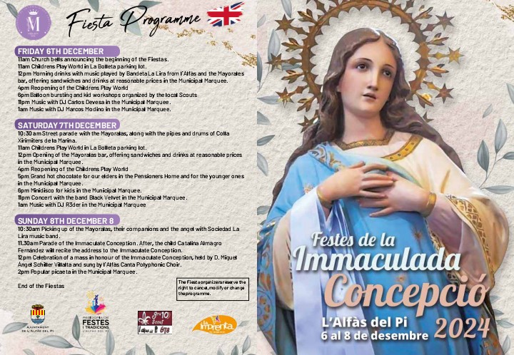 La jornada del sábado 7 de diciembre dará comienzo con una pasacalle de las Mayoralas de la Purísima por las calles de l’Alfàs, acompañadas de la Colla de Xirimiters de La Marina.