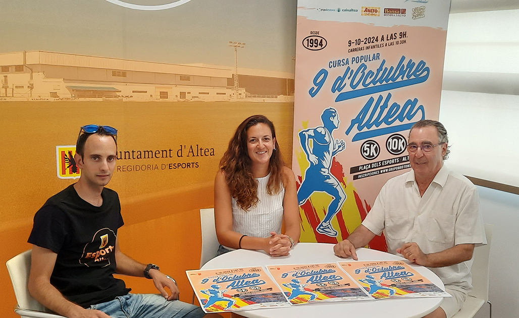 En la mañana de este miércoles ha tenido lugar la presentación de la 30 edición de la Carrera 9 d’Octubre de Altea. Una carrera popular que tiene previstas varias categorías, como la 5K, 10K y las carreras infantiles. Así lo han dado a conocer la edil de Deportes, Sara Soler; el responsable de grupo Brotons, Pepe Brotons y el representante del Club d’Atletisme Altea y atleta, Ángel López.