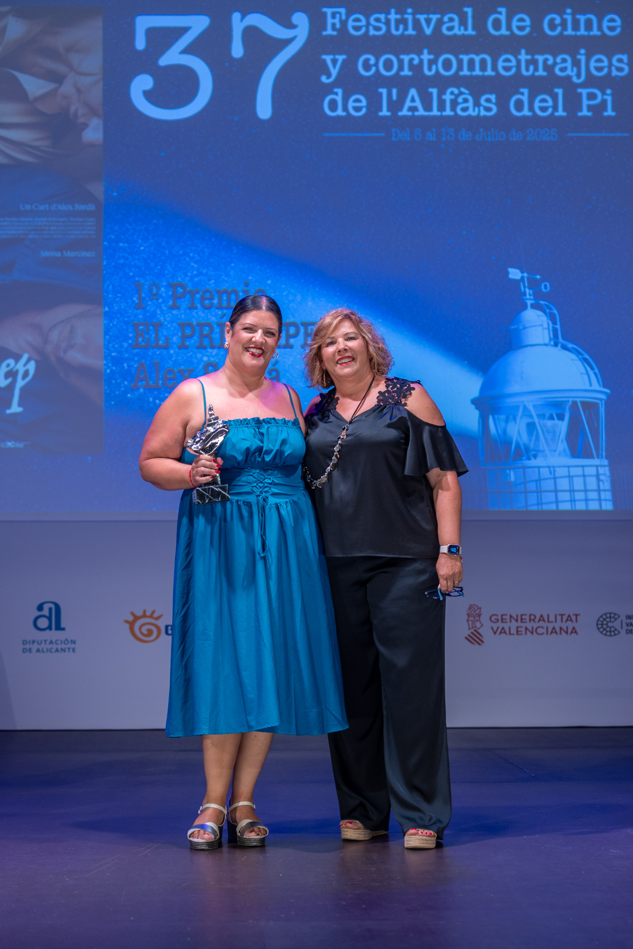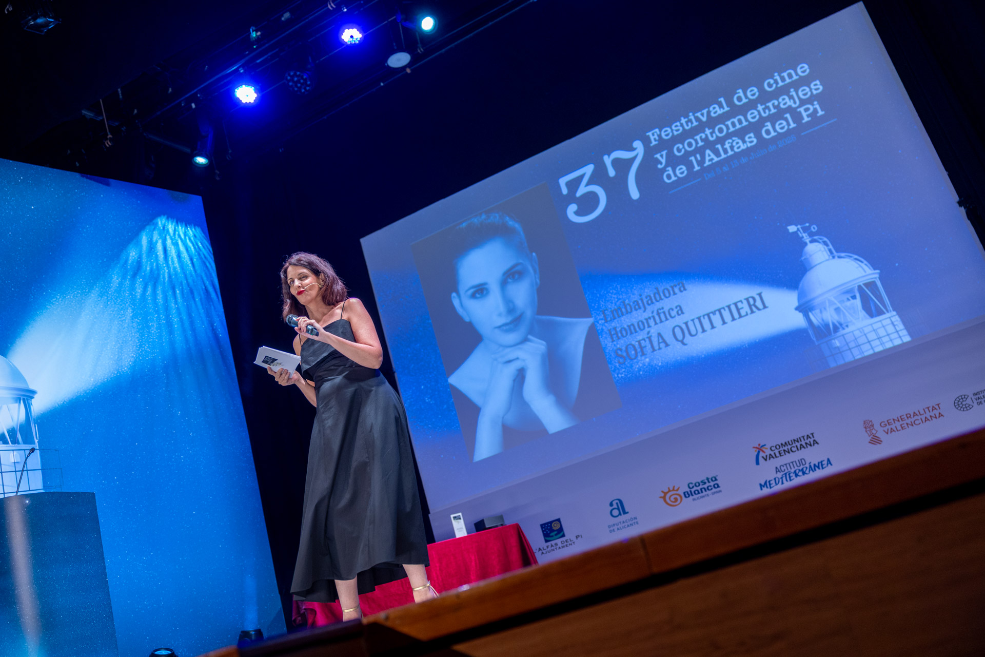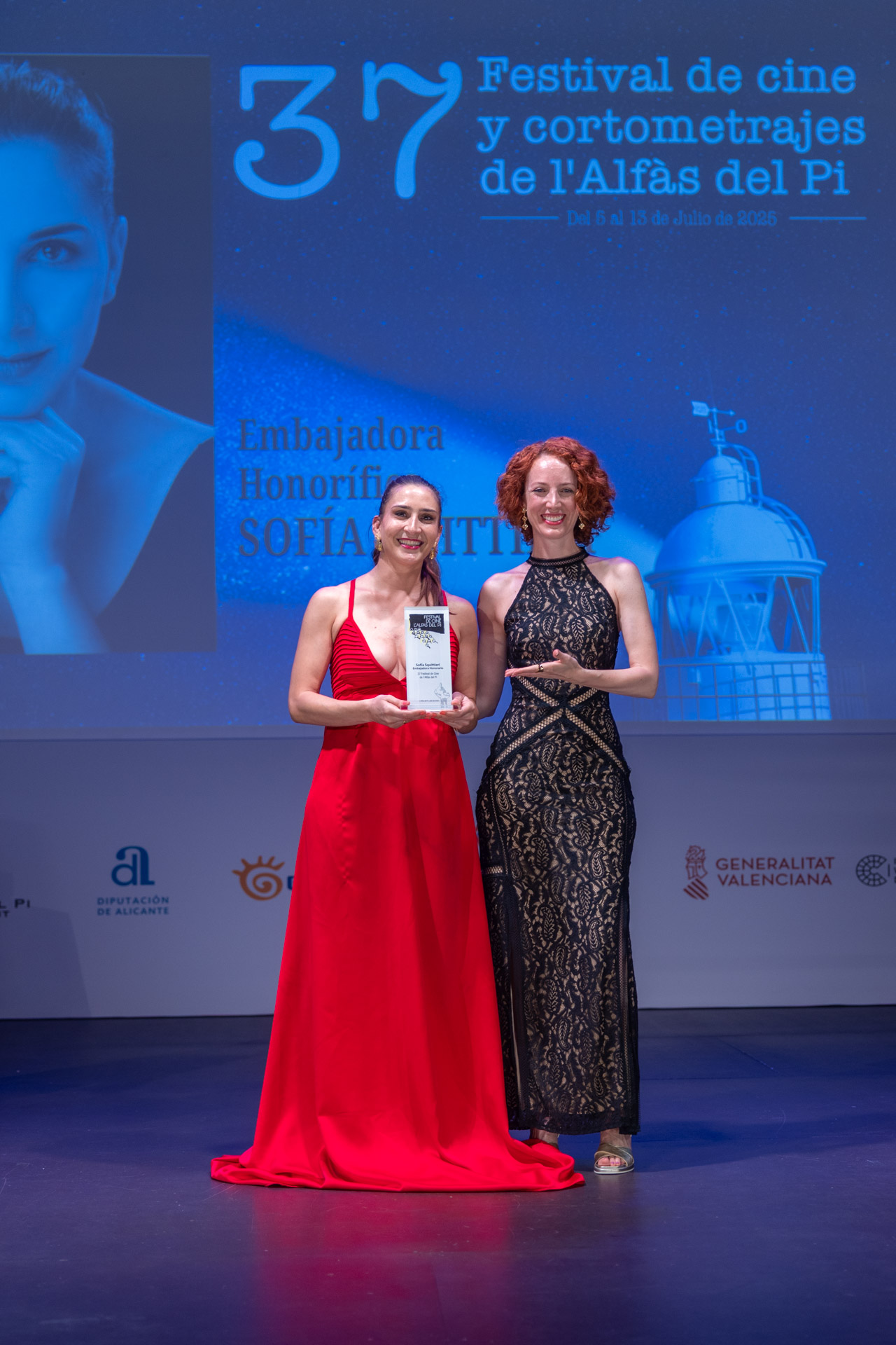 Uno de los momentos más emotivos de la noche fue el nombramiento de la actriz y guionista Sofía Squittieri como Embajadora Honorífica del 37 Festival de Cine de l’Alfàs del Pi, un reconocimiento que recibió de manos de la actriz alicantina Rebeca Sala, quien destacó su entusiasmo, sus ganas de crear y su pasión por la profesión.