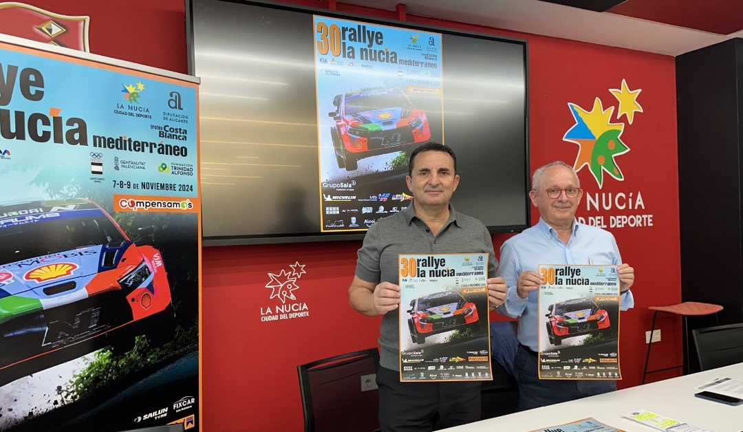 En la presentación del cartel oficial del 30º Rallye La Nucía – Mediterráneo Trofeo Costa Blanca han participado Vicente Cabanes, director del Rallye y Bernabé Cano, alcalde de La Nucía. La edición de 2024 del 30º Rallye La Nucía – Mediterráneo ‘Trofeo Costa Blanca’ ofrecerá una nueva oportunidad a los aficionados de disfrutar de la emoción de un rallye del máximo nivel por las comarcas de la Montaña y de la Marina de la Provincia de Alicante.