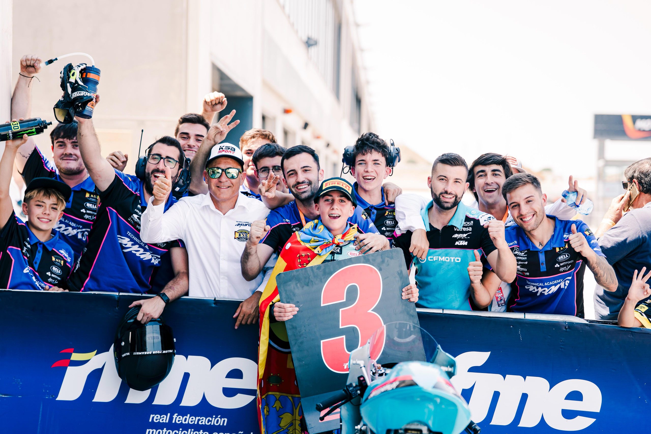 Enzo Zaragoza #85: “El fin de semana empezó bien recopilando buenos datos el jueves y el viernes. Y así fue. En el crono logré un buen segundo puesto quedándome muy cerca de la ‘pole’. Salimos a la carrera convencidos, aunque un toque en la primera vuelta nos rompió la parte trasera de la moto. A pesar de ello, fuimos capaces de llevarnos la victoria. Un triunfo que, además, supone la primera en la historia del Aspar KSB Technical Academy. En la carrera del domingo, intentamos romper el grupo, pero no pudo ser. Nos quedamos ocho pilotos luchando por la victoria y una mala decisión nos relegó hasta la tercera posición. Ha sido un fin de semana fantástico del que nos vamos con buenas sensaciones de cara a Navarra y, tras resolver los problemas de carreras anteriores, demostramos que ya estamos ahí. Por último, quiero dar las gracias a mi equipo y a Kike Bañuls por apoyarme y ayudarme siempre”.