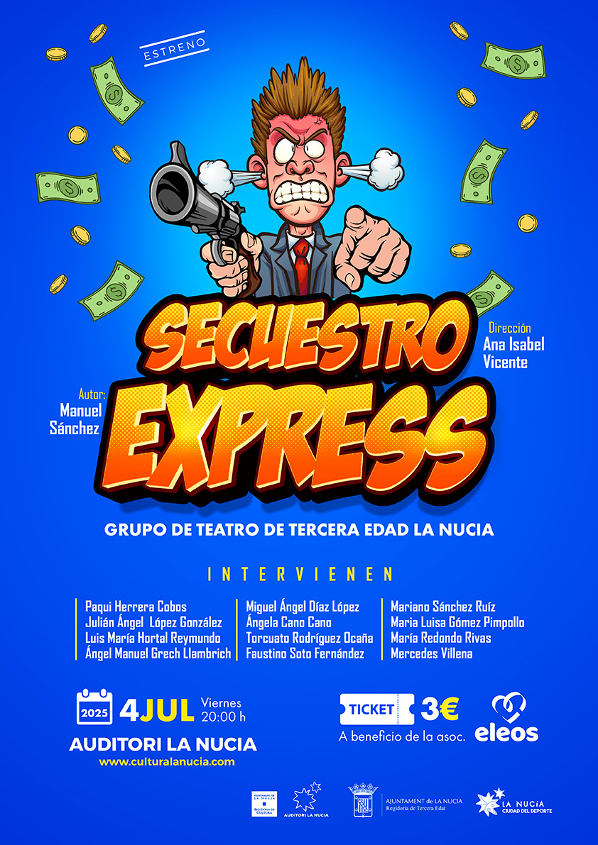 Se trata de la última obra teatral del escritor nuciero Manuel Sánchez. Es un estreno solidario a beneficio de la Asociación Eleos y las entradas están a la venta en las taquillas de l’Auditori y en La Casilla, y a través de la plataforma: https://www.vivaticket.es/ticket/secuestroexpresestreno/SECUESTROEXP
