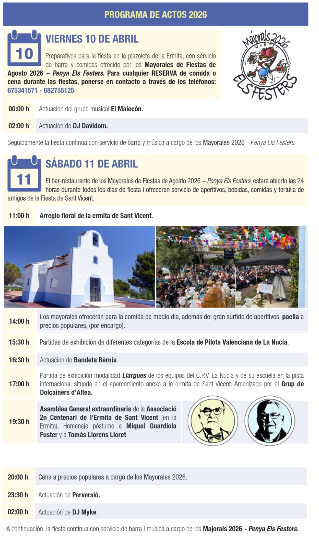 “Un año más llegan las esperadas Festes de Sant Vicent 2026. Unos días donde la ermita del Captivador reúne a “alteans, alfasins i nuciers”. Estas fiestas tienen un encanto especial por el lugar donde se celebran, en un paraje incomparable y un ambiente de convivencia entre vecinos y visitantes. Nos espera un completo programa de actos, con actividades de todo tipo y música en la carpa festera, donde habrá servicio de barra por parte dels Majorals. También tendremos deporte con las partidas de pilota valenciana y la carrera pedestre.