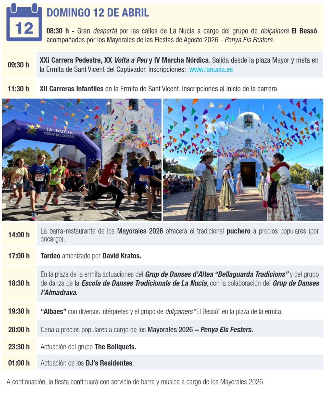 El domingo 12 de abril por la tarde (18,30 horas) en la plaça de l’Ermita tendrán lugar las actuaciones del Grup de Danses d’Altea “Bellaguarda Tradicions” y el grupo de danza de “l’Escola de Danses Tradicionals de La Nucia” con la colaboración del “Grups de Danses l’Almadrava”. A las 19,30 horas “Albaes” con diversos intérpretes y el “grup dolçainers el Bessó”.