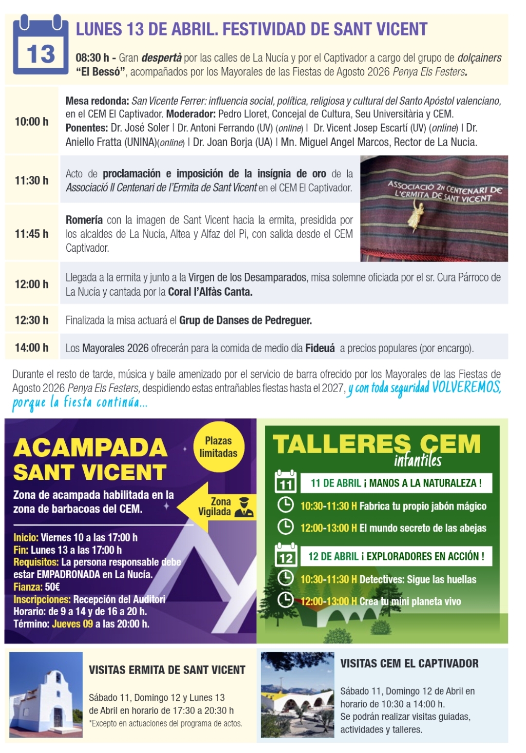 El lunes 13 de abril, día de Sant Vicent, a las 10 horas se realizará la mesa redonda “Sant Vicent Ferrer: influencia social, política, religiosa i cultural del Sant Apòstol valencià” en el CEM Captivador. Una sesión que reunirá ponentes: Dr. José Soler, Dr. Antoni Ferrando, Dr. Vicent Josep Escartí, Dr. Aniello Fratta, Dr. Joan Borja y Mn. Miguel Ángel marcos, rector de La Nucía. A las 11,45 horas comenzará la romería de la imagen del santo que saldrá desde el CEM del Captivador.