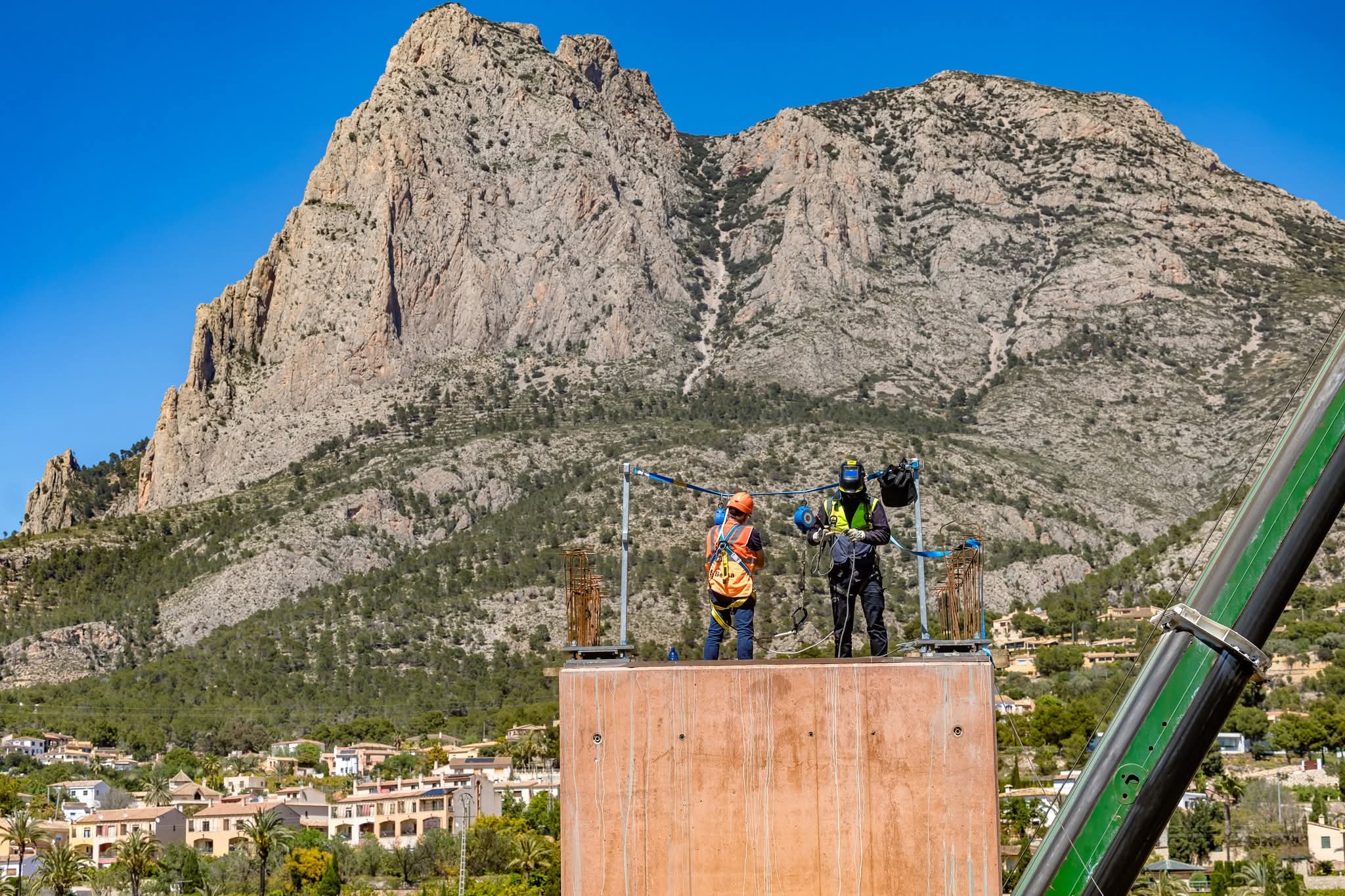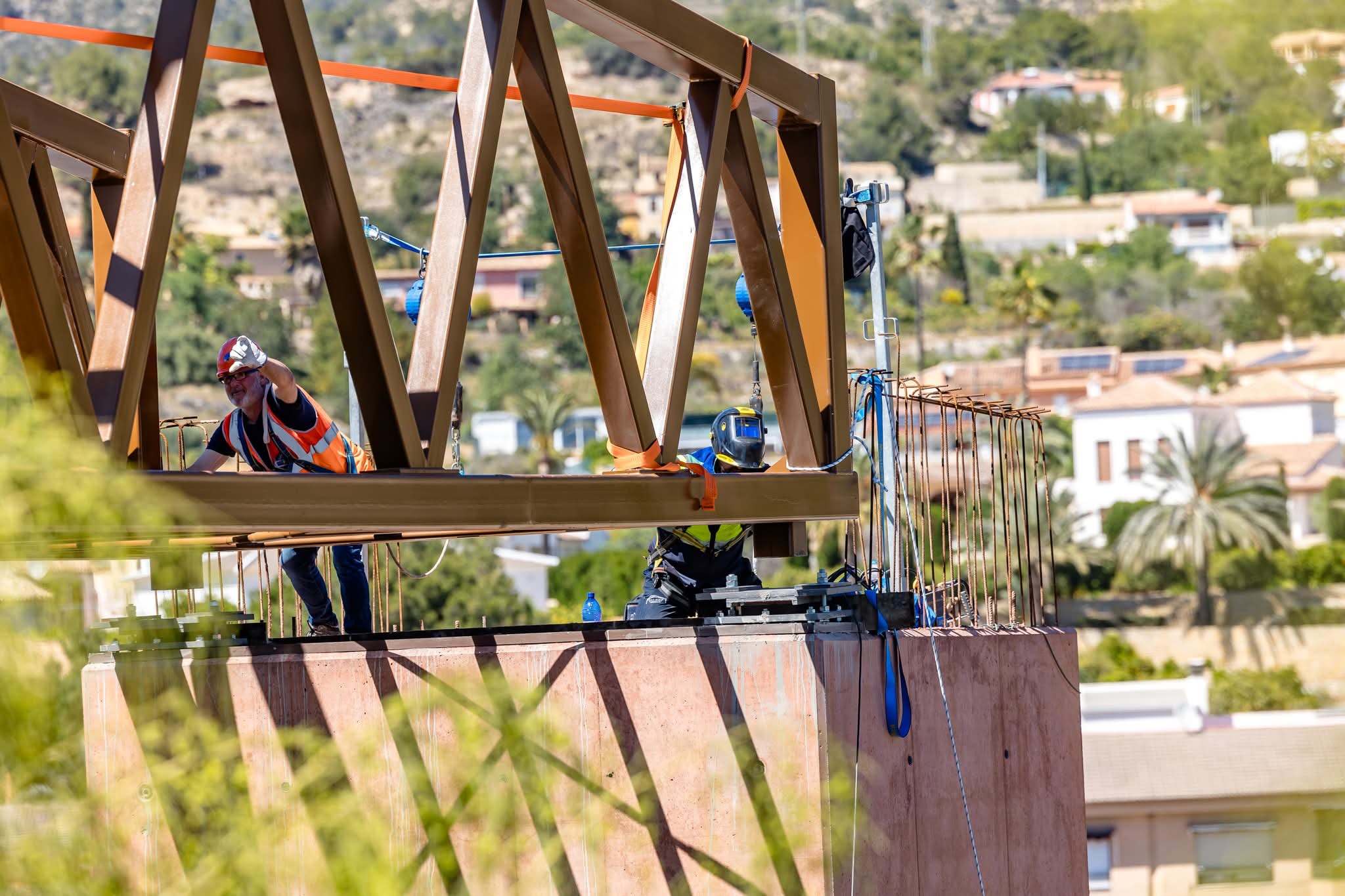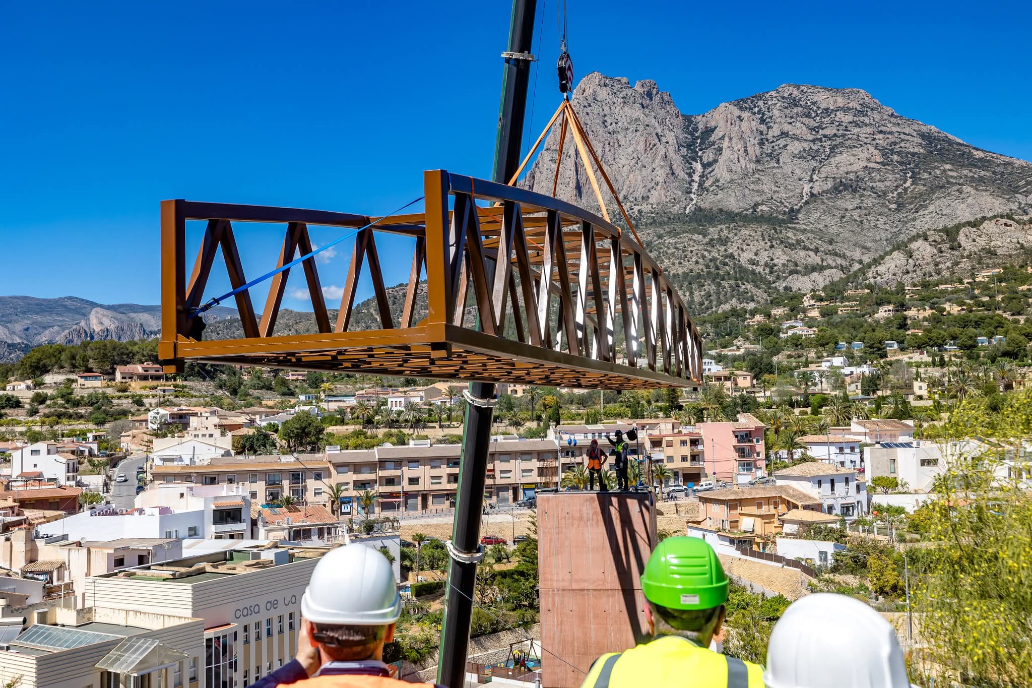 12 toneladas de peso. 27 metros de longitud. Y a 26 metros de altura. Es la pasarela que conecta el elevador con el Castell de Finestrat. Hoy se ha instalado con dos grúas de grandes dimensiones en un trabajo muy preciso y milimétrico. La alcaldesa, Nati Algado, estuvo allí junto al Primer Teniente de Alcalde y concejal de Urbanismo, Víctor Darío Llinares, el edil de Fondos Europeos, Héctor Baldó, el equipo municipal de Urbanismo y de la empresa adjudicataria de esta actuación, BECSA, además de la empresa Carpimer, fabricante de la pasarela.