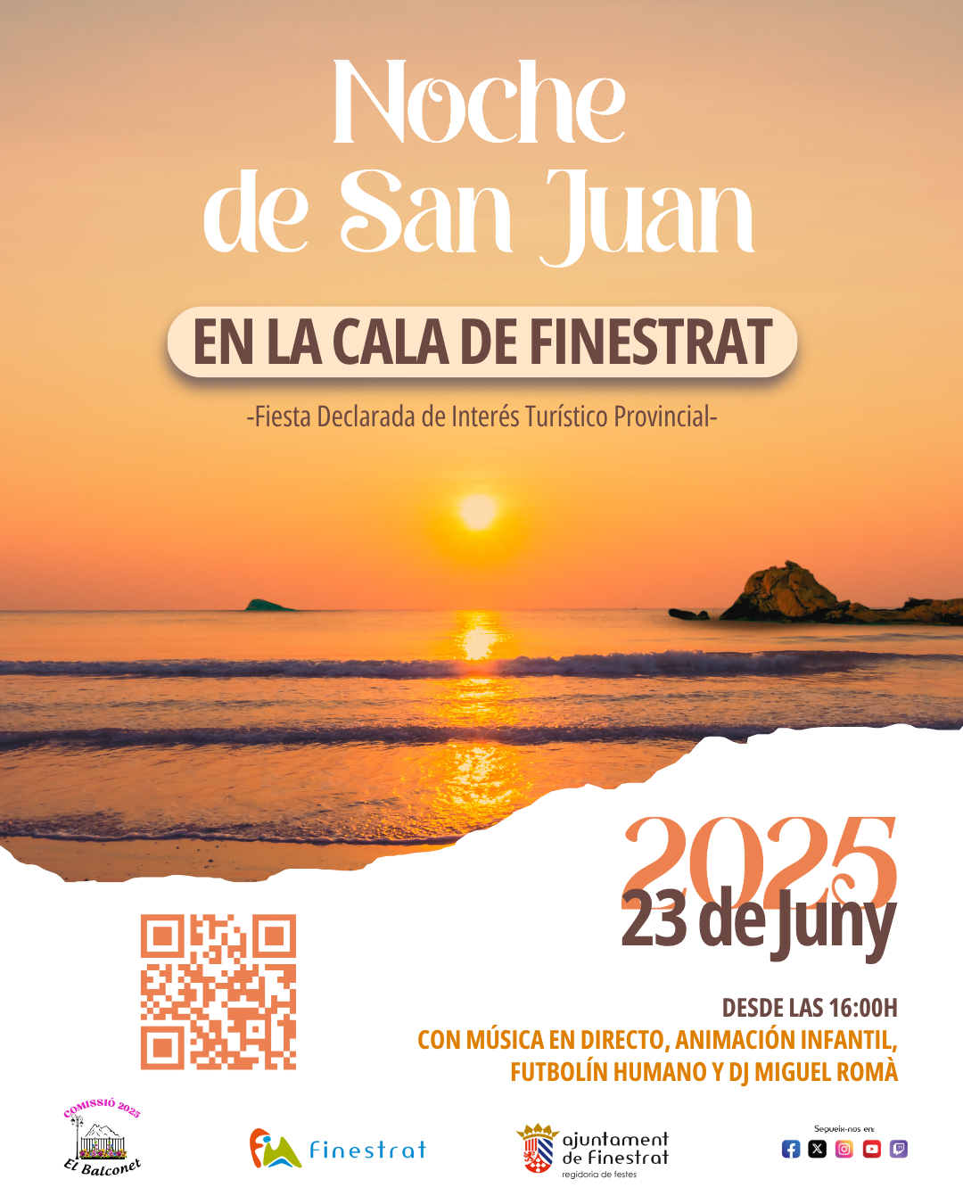La concejala de Fiestas, Sara Llorca, avanzó el programa que amenizará esta tarde-noche tan especial desde la playa de Finestrat. “Como siempre, ofrecemos un marco incomparable para esta fecha tan especial. Empezaremos sobre las 16:30 horas pensando en los más pequeños con animación infantil y talleres. También incorporaremos una actividad muy divertida como es el futbolín humano en el que todos podrán participar. La música estará presente durante todo el evento, además de barra con precios populares a cargo de la Comissió de Festes El Balconet. “Estamos seguros que nuestra Cala volverá a brillar y a convertirse en el epicentro de esta noche tan especial de San Juan que, como sabéis, es una Fiesta declarada de Interés Turístico Provincial por la Generalitat Valenciana, concluyó la edil de Fiestas, Sara Llorca.
