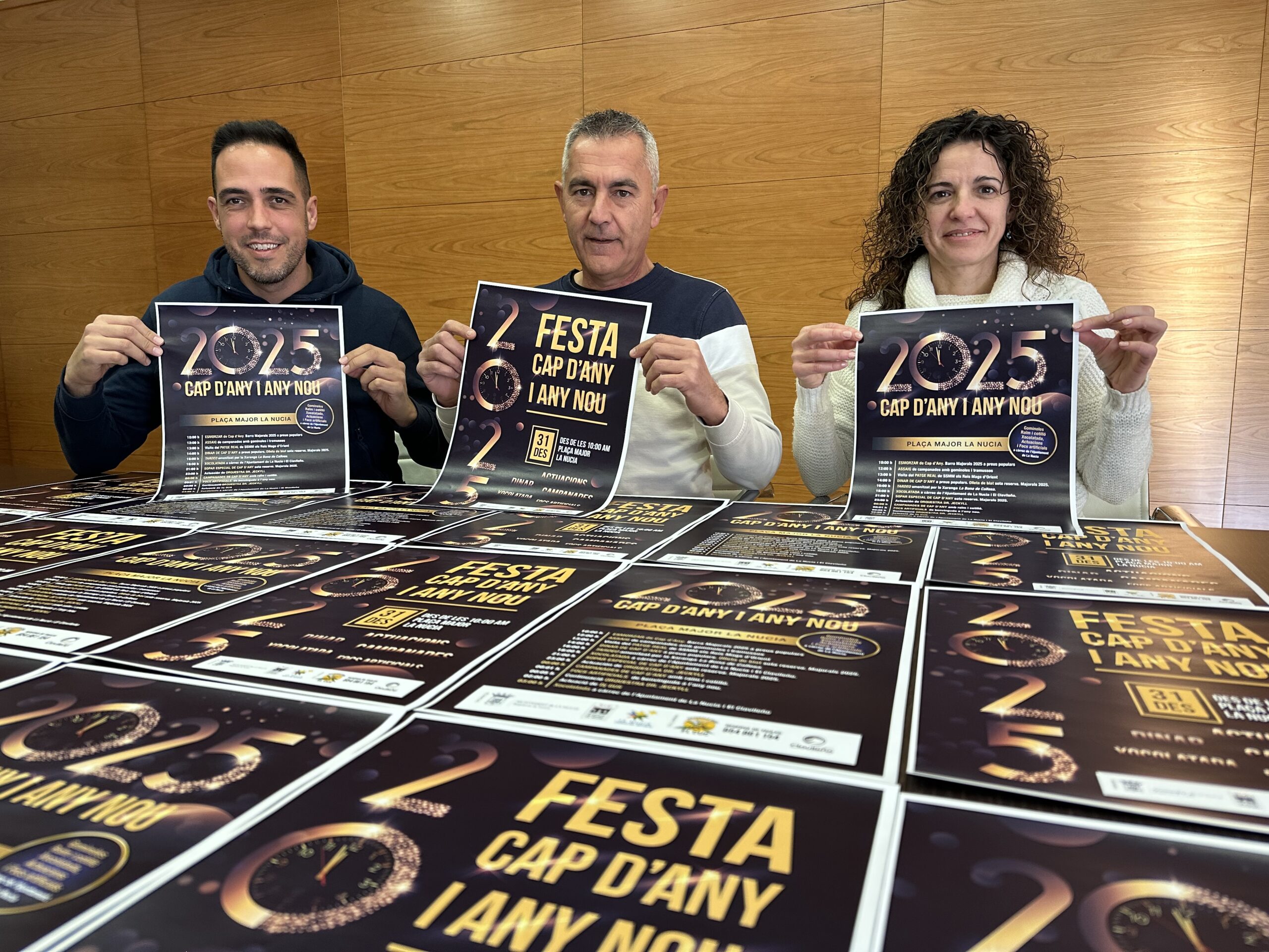 Esta gran “Fiesta de Fin de Año” está organizada por el Ayuntamiento de La Nucía con la colaboración dels Majorals 2025-Penya El Cuc y l’Associació de Penyes. La presentación de la “Gran Fiesta de Nochevieja 2024-2025” ha contado con la presencia de Maridora Ivorra, Majorals 2025-Penya El Cuc, Diego Llorca, presidente de l’Associació de Penyes y Cristóbal Llorens, concejal de fiestas
