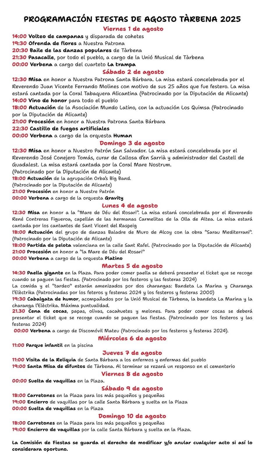 La Comisión de Fiestas se guarda el derecho de modificar y/o anular cualquier acte si asi to considerara oportuno
