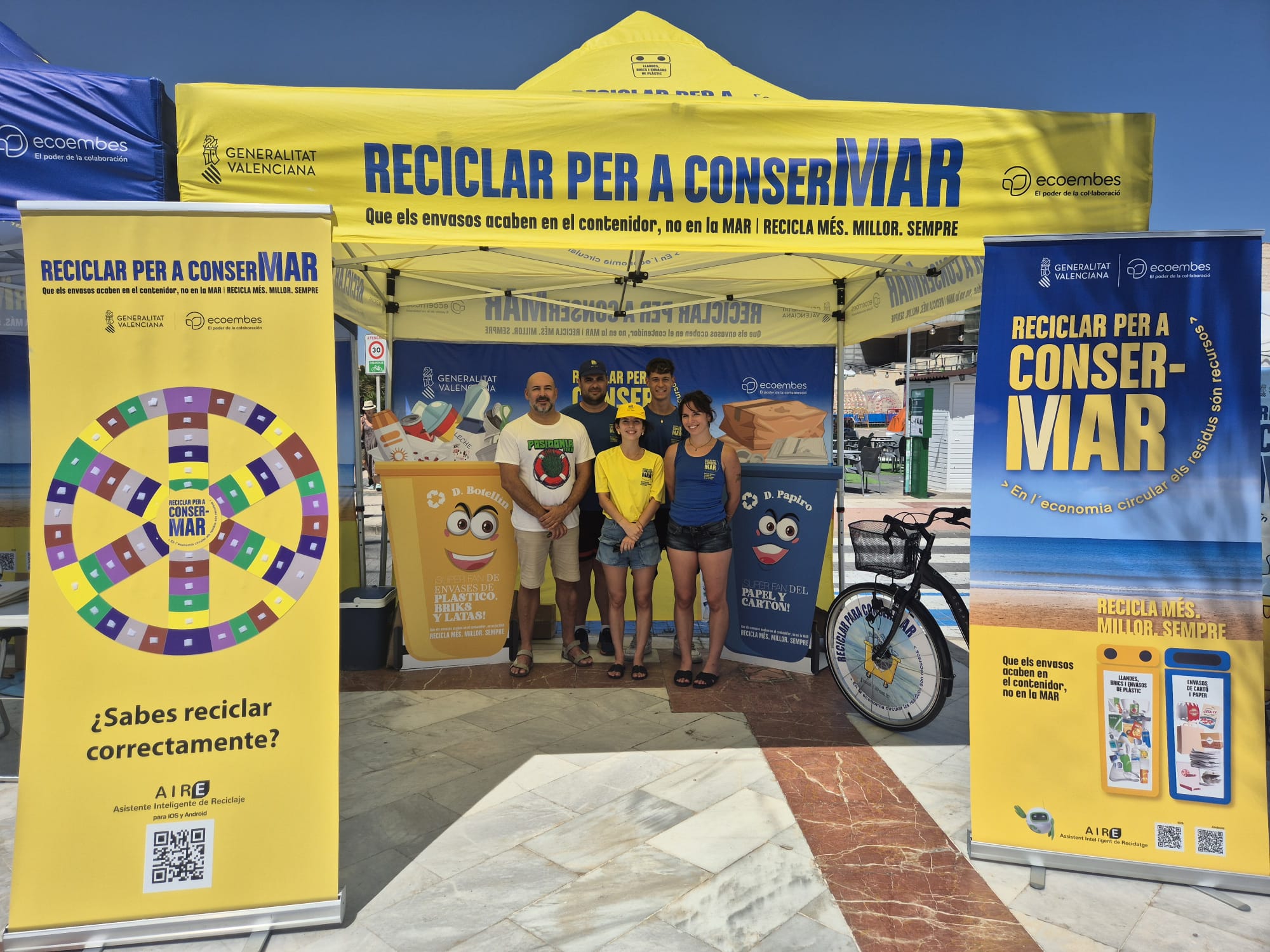 La iniciativa ‘Reciclar para Consermar’ tiene como objetivo fomentar entre los ciudadanos el depósito en el contenedor amarillo de envases de plástico, metal y briks y en el azul de papel y cartón, para hacer posible su reciclaje y llamar la atención para frenar la basuraleza, es decir, el abandono de los residuos en la costa .