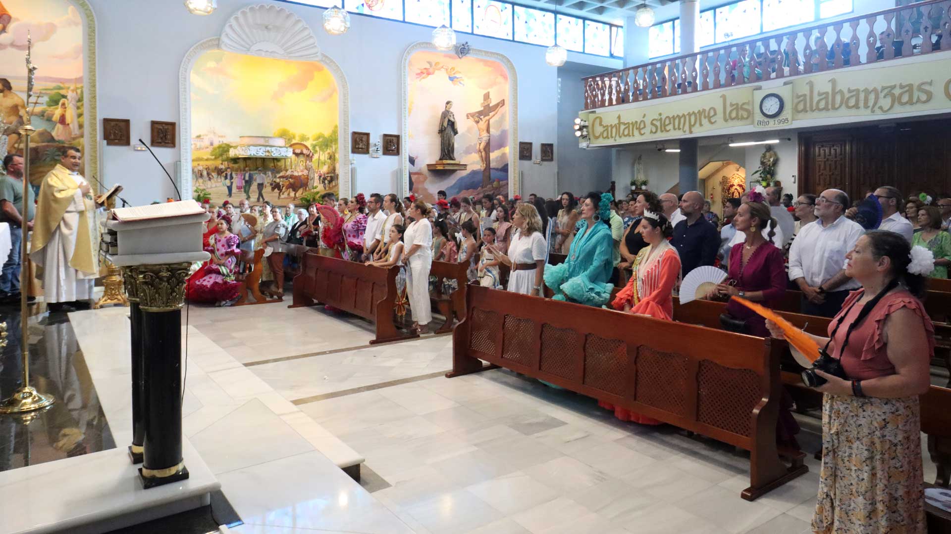 Decenas de personas llenaron por completo los bancos de la iglesia para participar en la misa rociera dedicada a la Blanca Paloma, con la presidenta de la Casa de Andalucía, Leonor Jiménez, y la reina de 2025, Kenia Moreno, a la cabeza.
