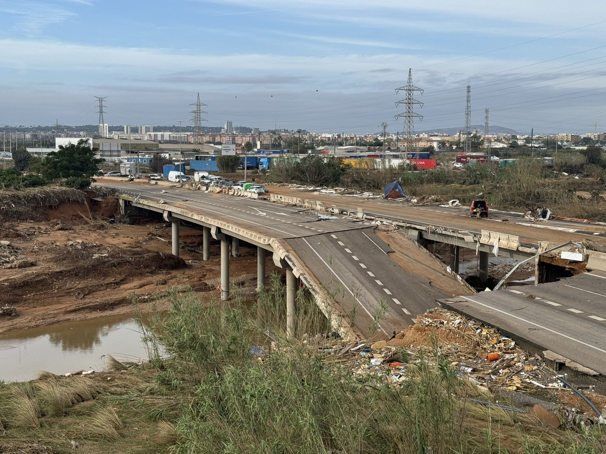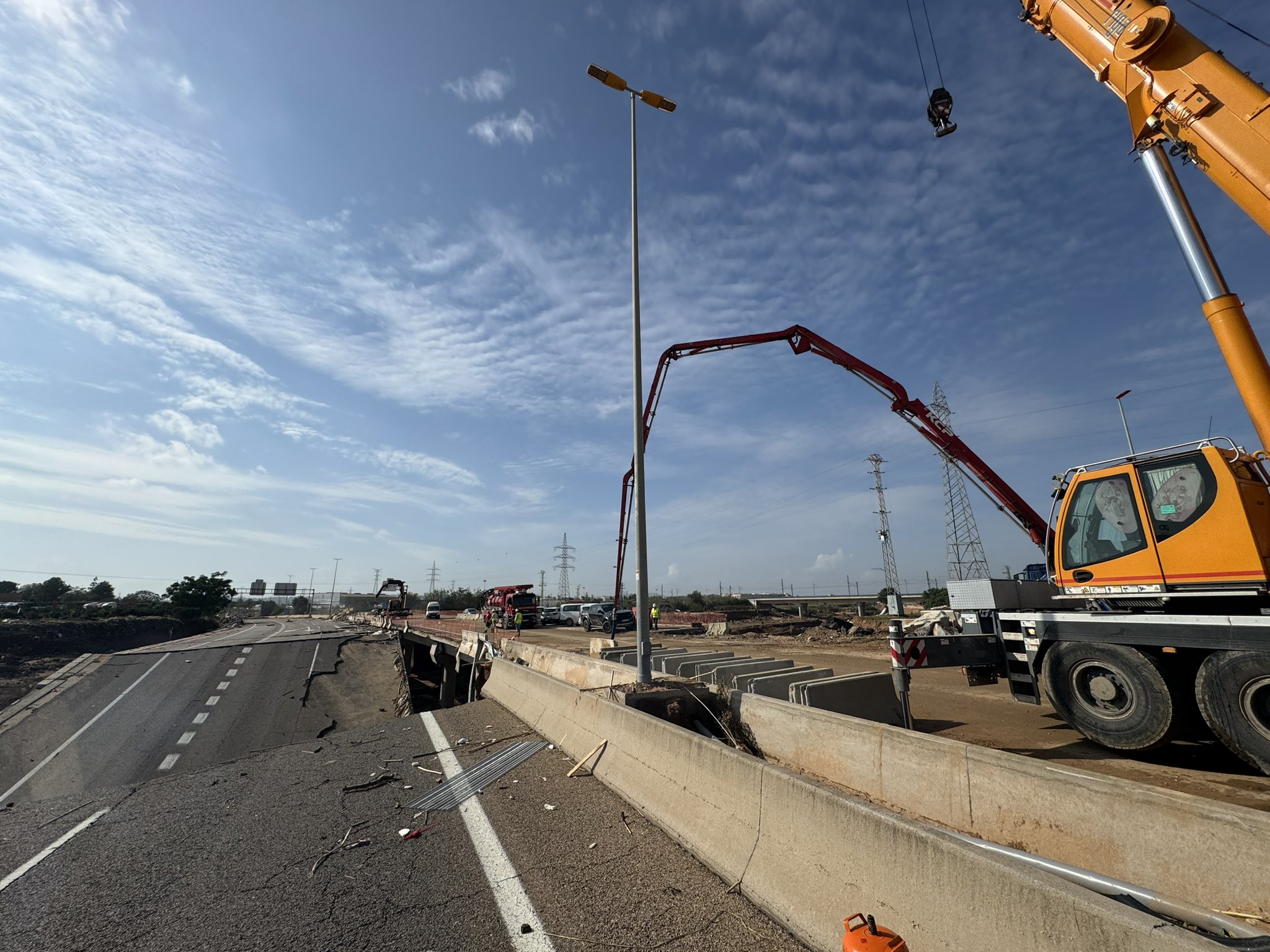 Asimismo, se están llevando a cabo obras en la CV-36, donde dos puentes ubicados en el P.K. 8+640 también se han derrumbado. Además, en el resto del trazado los trabajos de limpieza y acondicionamiento del asfalto avanzan a buen ritmo para poder habilitar una nueva vía de entrada provisional a Torrent. En la misma localidad, en la CV-403, se están realizando intervenciones en el P.K. 4+270 para reforzar los cimientos de un puente que ha sufrido daños.