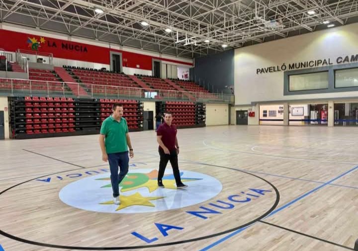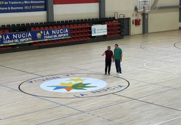 Esta semana Sergio Villalba, concejal de Deportes y Bernabé Cano, alcalde de La Nucía, han visitado la pista del Pabellón Camilo Cano, que se encuentra en proceso de secado, tras concluir todas las obras de rehabilitación (lijado y barniz).