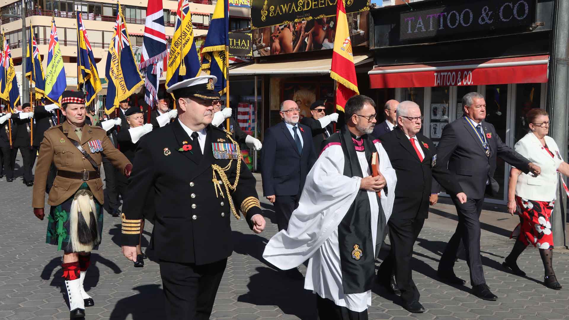 A las 15,45 horas, en la Avenida de Castellón, ha dado comienzo el tradicional desfile de estandartes acompañados por la ‘Torrevieja Pipes and Drums’ que han puesto color y melodía a una jornada dedicada al recuerdo. Una marcha que ha sido seguida durante su trayecto por centenares de personas. El concejal de Presidencia, Juan Díaz, ha participado en el acto junto a la representante del National Chairman de la Royal British Legion (RBL), Anny Reid; el capitán de navío agregado militar, Stephen McGlory; el representante en el Membership Council RBL, Robert ‘Dusty’ Millar; el mayor Cameron Law del Estado Mayor de la OTAN en Bétera; la vicecónsul de Alicante, Sara Munsterhjelm; el presidente local de la RBL, Paul Kane; y el reverendo Richard Seabrook, páter oficial de la RBL Spain.