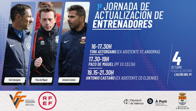 La Casa de Cultura de l’Alfàs del Pi acogerá el próximo 4 de octubre la primera Jornada de Actualización para Entrenadores. Una actividad formativa que organiza la Real Federación Española de Fútbol para facilitar a los entrenadores la obtención del ‘Certificado de Actualización y Reciclaje’. Esta formación, que se desarrollará en horario de tarde en la Casa de Cultura, contará con la participación como ponentes de Toni Astorgano (ex asistente FC Andorra), Paco de Miguel (PF EX Celta) y Antonio Castaño (ex asistente CD Eldense).