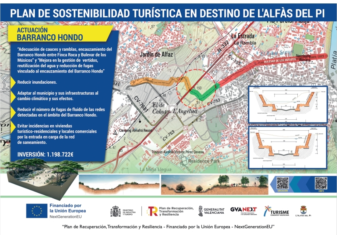 Obras financiadas por la Unión Europea, a través de los Fondos NextgenerationEU, para el desarrollo de dos Planes de Sostenibilidad Turística en Destino (PSTD), correspondiente a las convocatorias extraordinarias de 2023. Proyectos en los que colaboran varias administraciones, como el Ministerio de Industria y Turismo, La Generalitat Valenciana, Turisme Comunitat Valenciana y el Ayuntamiento de l’Alfàs del Pi.