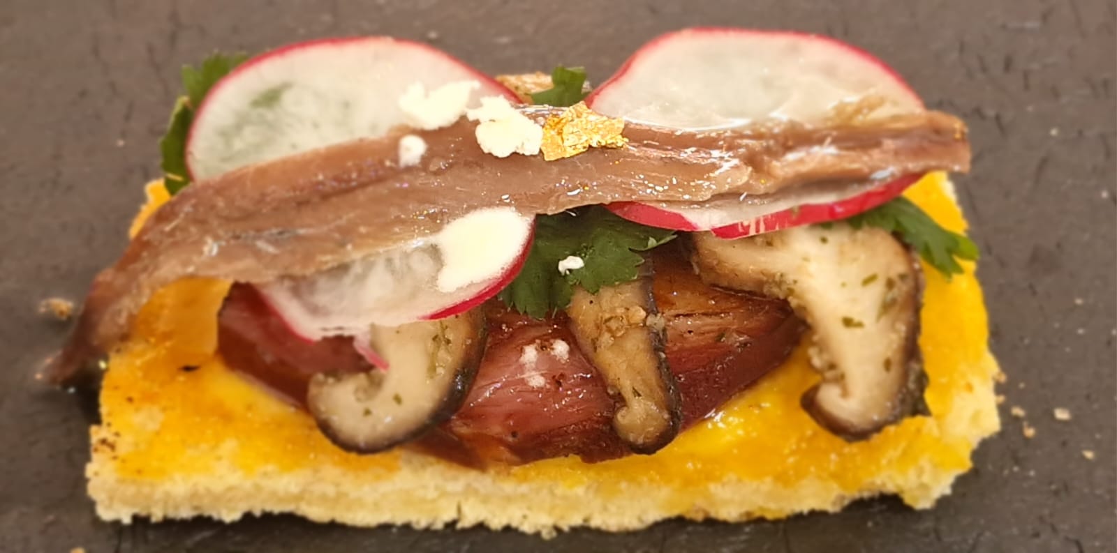 En segunda posición ha quedado “Vinomio” con su “Lingote de pato crujiente, con mayo hoisin y cebolleta encurtida al togarashi”, que consiguió una valoración de 671 puntos. Galardón dotado con una dotación económica de 250 €