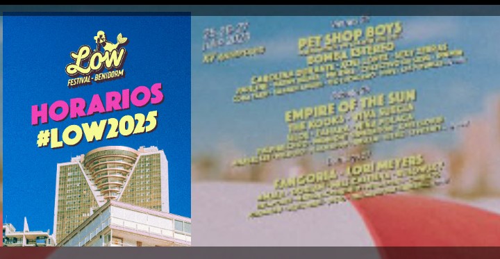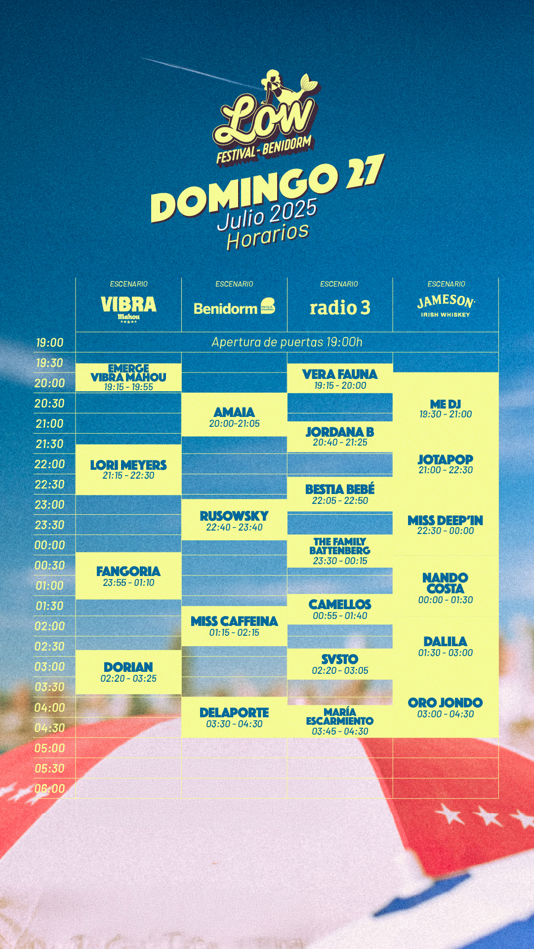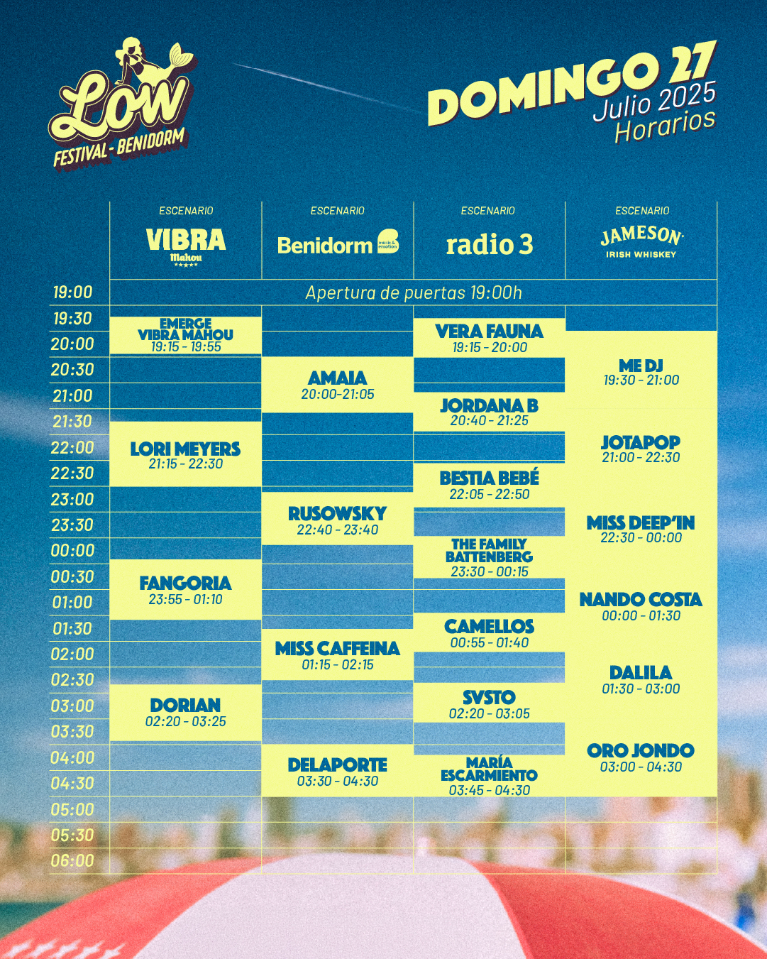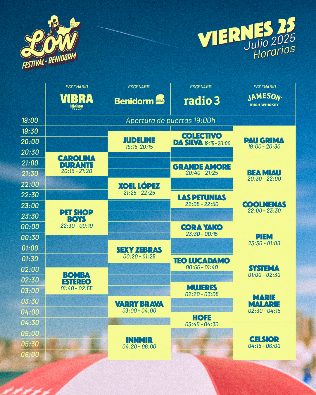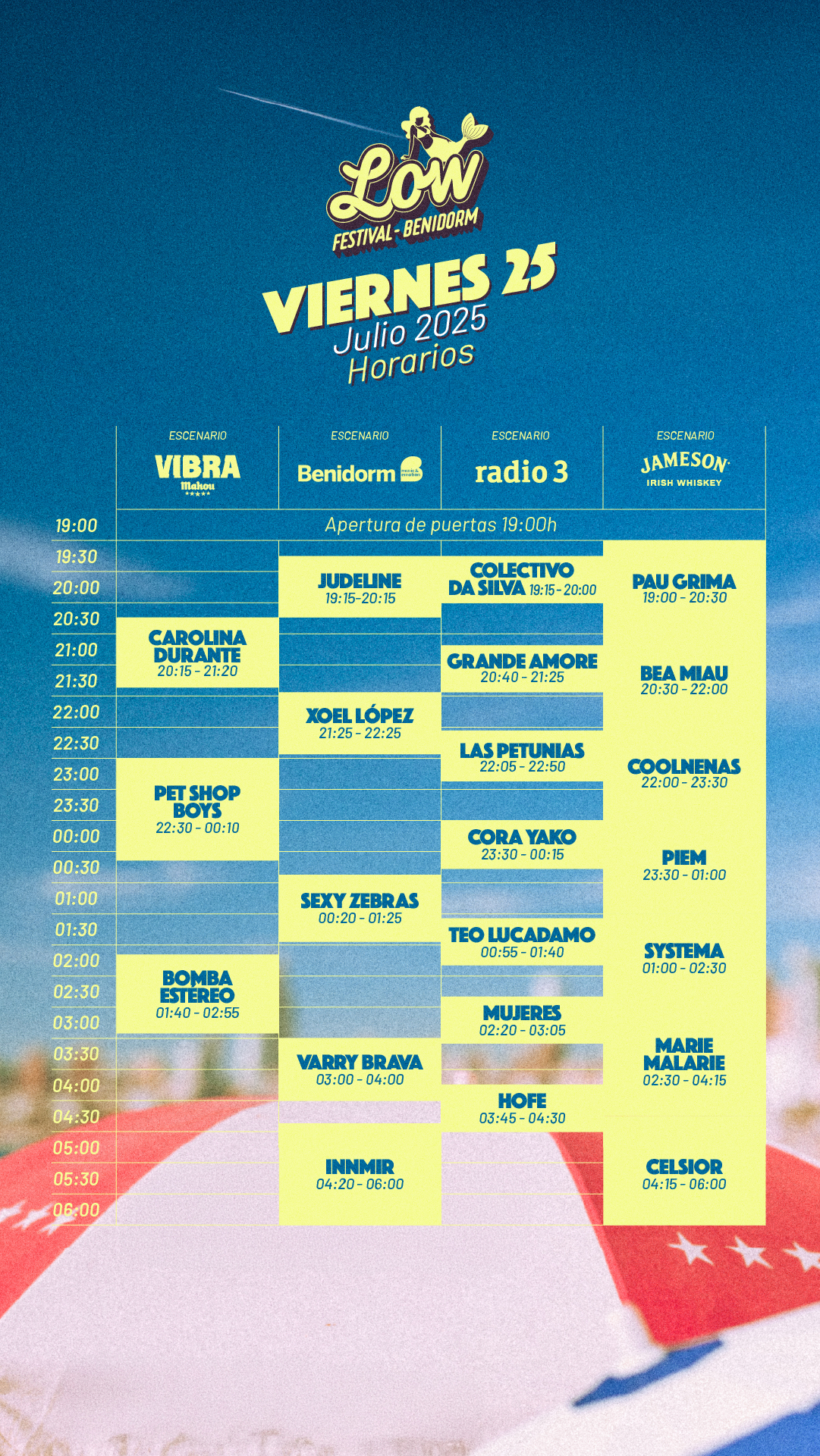 La organización del festival ha presentado los horarios de sus cuatro escenarios: Escenario Vibra Mahou, Escenario Benidorm, Escenario Radio 3 y Escenario Jameson, unos horarios que, una vez más, no tienen solapamientos en los dos escenarios principales para que todos los lowers puedan disfrutar de los conciertos. El viernes arrancará con Judeline y Colectivo Da Silva, mientras que el Escenario Vibra Mahou arrancará con Carolina Durante, seguido de Pet Shop Boys y Carolina Durante. Por su parte, los bailes no pararán hasta las 6:00 de la mañana con el cierre de Celsior.