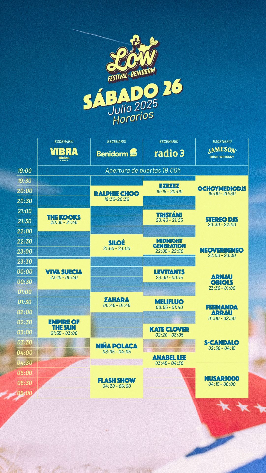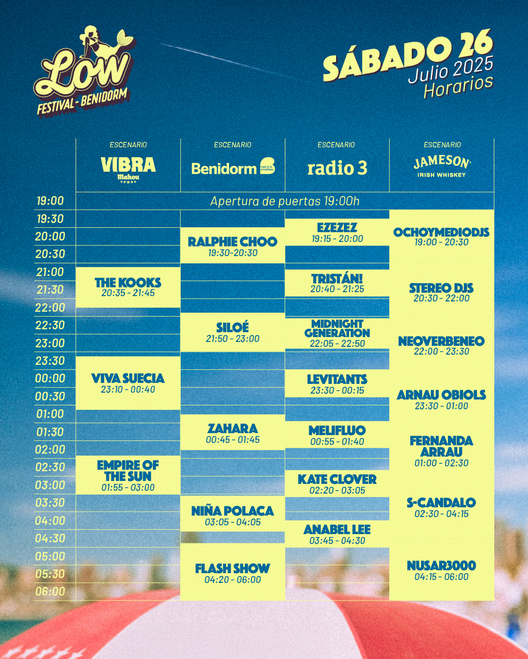 El sábado continuará con Ralphie Choo – en el Escenario Benidorm-, mientras que The Kooks inaugurarán el segundo día de festival en el Escenario Vibra Mahou, seguidos de Viva Suecia y Empire of the Sun mientras que Siloé, Zahara y Niña Polaca seguirán en el segundo escenario con un cierre repleto de bailes con Flash Show.