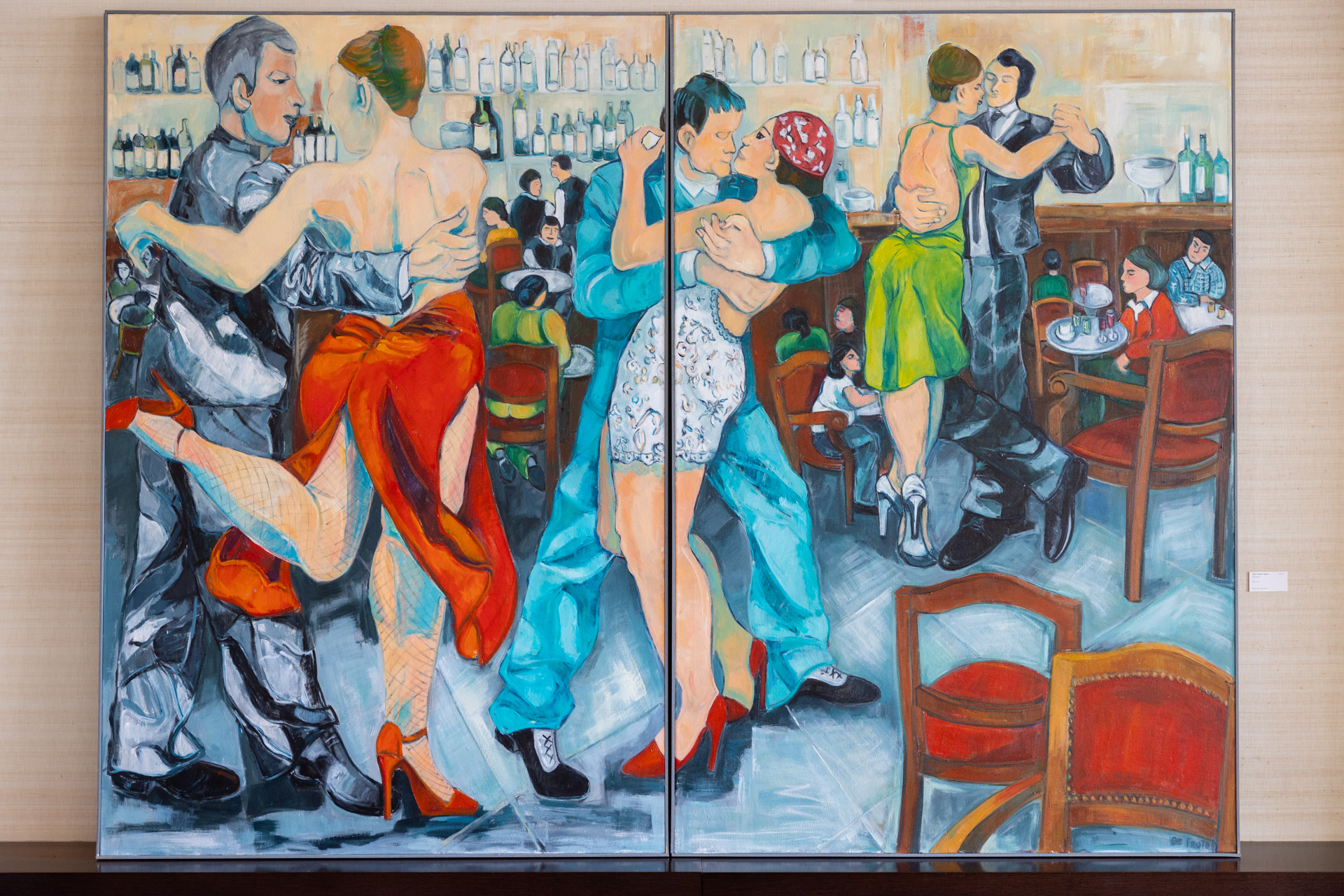 En sus retratos y escenas cotidianas, María Jesús de Frutos destaca la figura humana sobre el espacio, mostrando el lado amable de la vida y la importancia del presente. Sus pinturas, llenas de gestualidad y emoción, presentan cuerpos voluminosos, miradas intensas y labios carnosos, con un uso exuberante del color rojo en diversas tonalidades, simbolizando la vida y la pasión. En sus obras de tango y milonga, se enfoca en la sensualidad y el movimiento elegante, reflejando su propia emoción y belleza. Sus escenas de mujeres transmiten seguridad, fuerza y vitalidad, mostrando una intensa alegría de vivir. Así lo destacó tras la inauguración Esperanza Durán, artista plástica, directora de la Casa de Cultura de l’Alfàs del Pi y comisaria de la exposición.