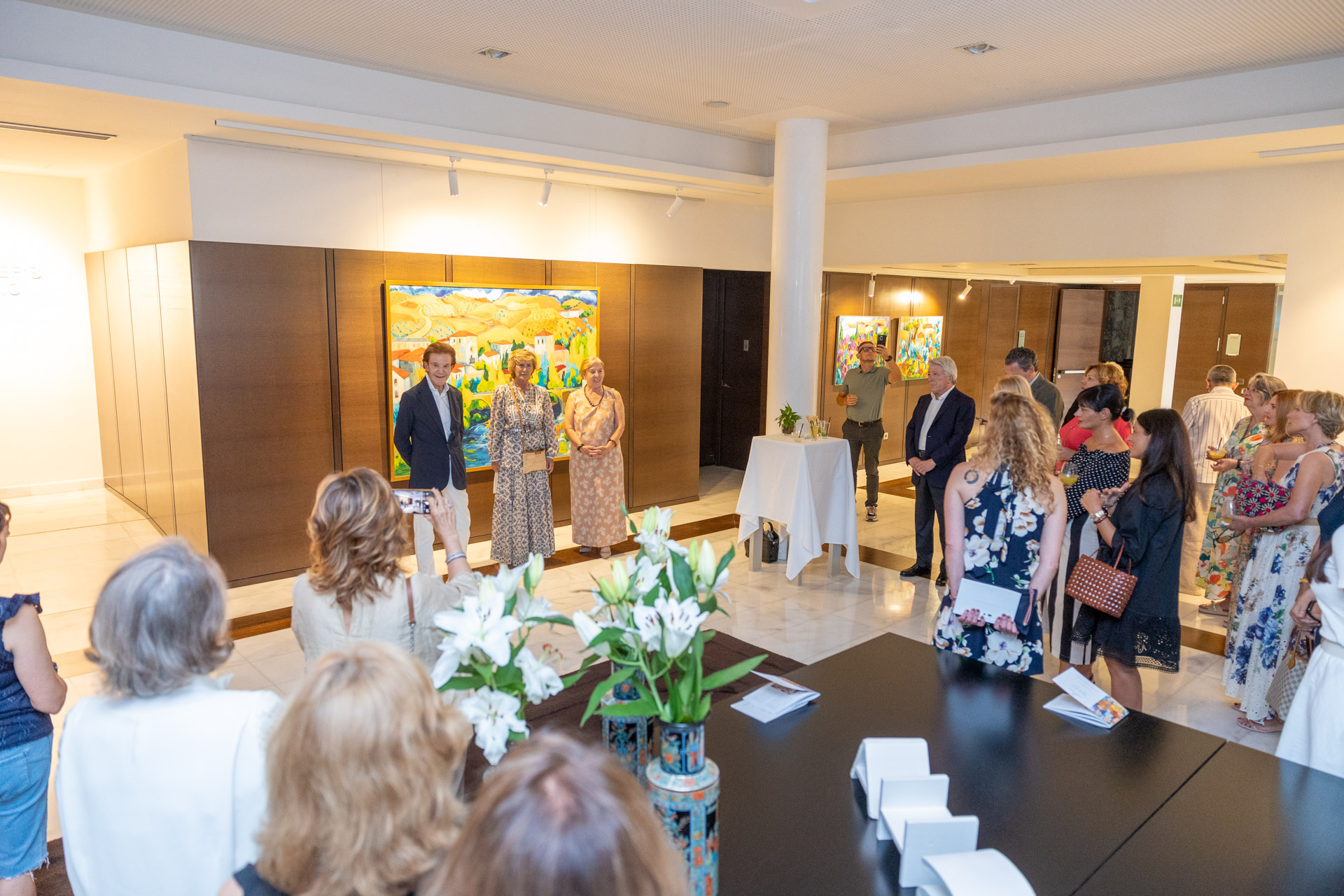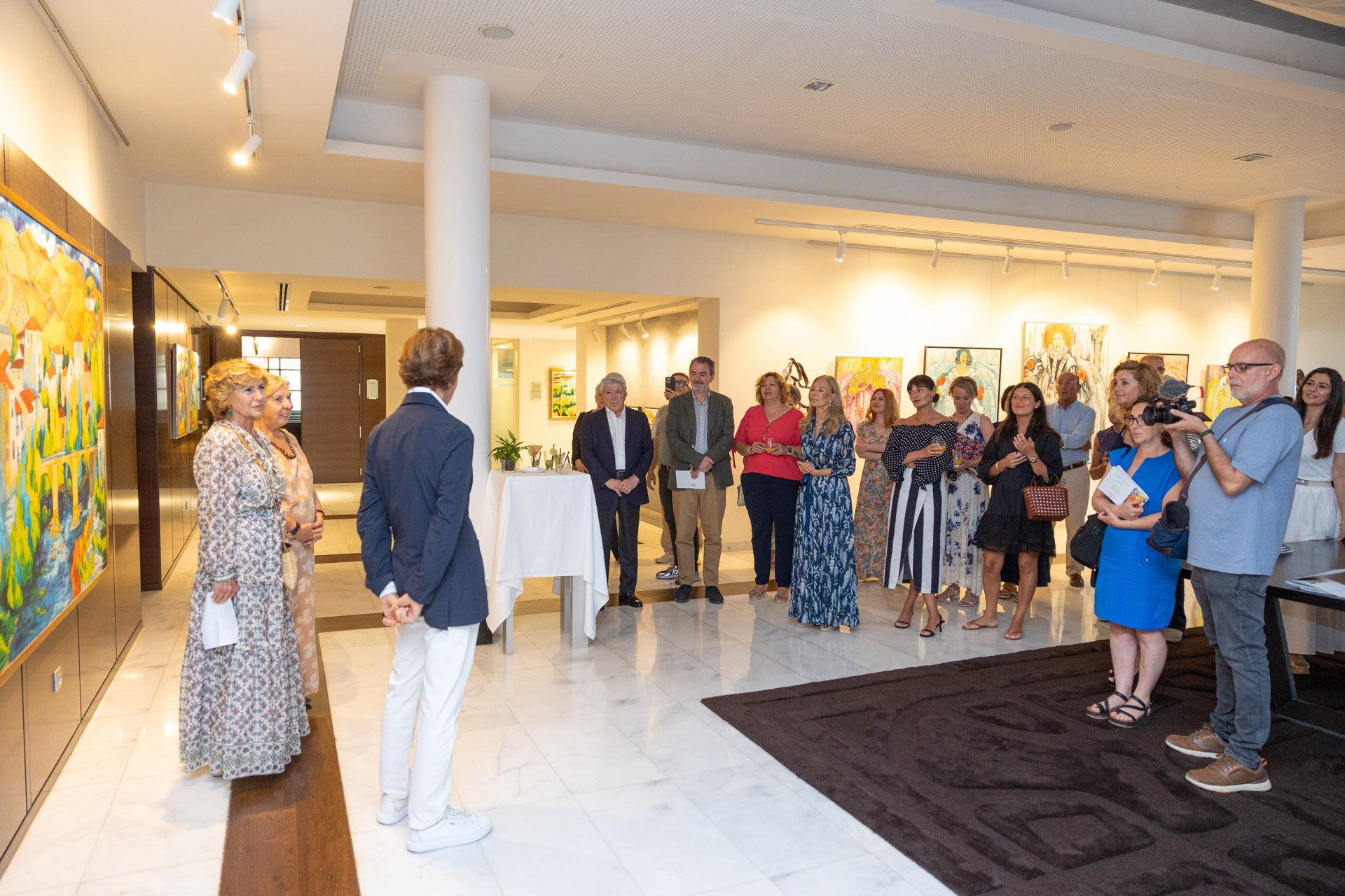 “Contemplando la naturaleza surgen emociones, vivencias que estallan en mi interior y necesito plasmar: paisajes que respiro, que me recuerdan momentos vividos en mi infancia y me provocan emociones felices, reuniones de amigos en torno a una mesa, compartiendo confidencias, celebrando… Necesitamos los unos de los otros… Y el arte cura, transforma, te consuela”, declaró María Jesús de Frutos durante el acto de inauguración, en el que se dieron cita, entre otros, el alcalde de l’Alfàs del Pi, Vicente Arques; el presidente fundador de Sha Wellness Clinic, Alfredo Bataller; el secretario general de ONU Turismo, Zurab Pololikashvili, y el productor cinematográfico y presidente del Atlético de Madrid, Enrique Cerezo, que es además marido de María Jesús de Frutos.