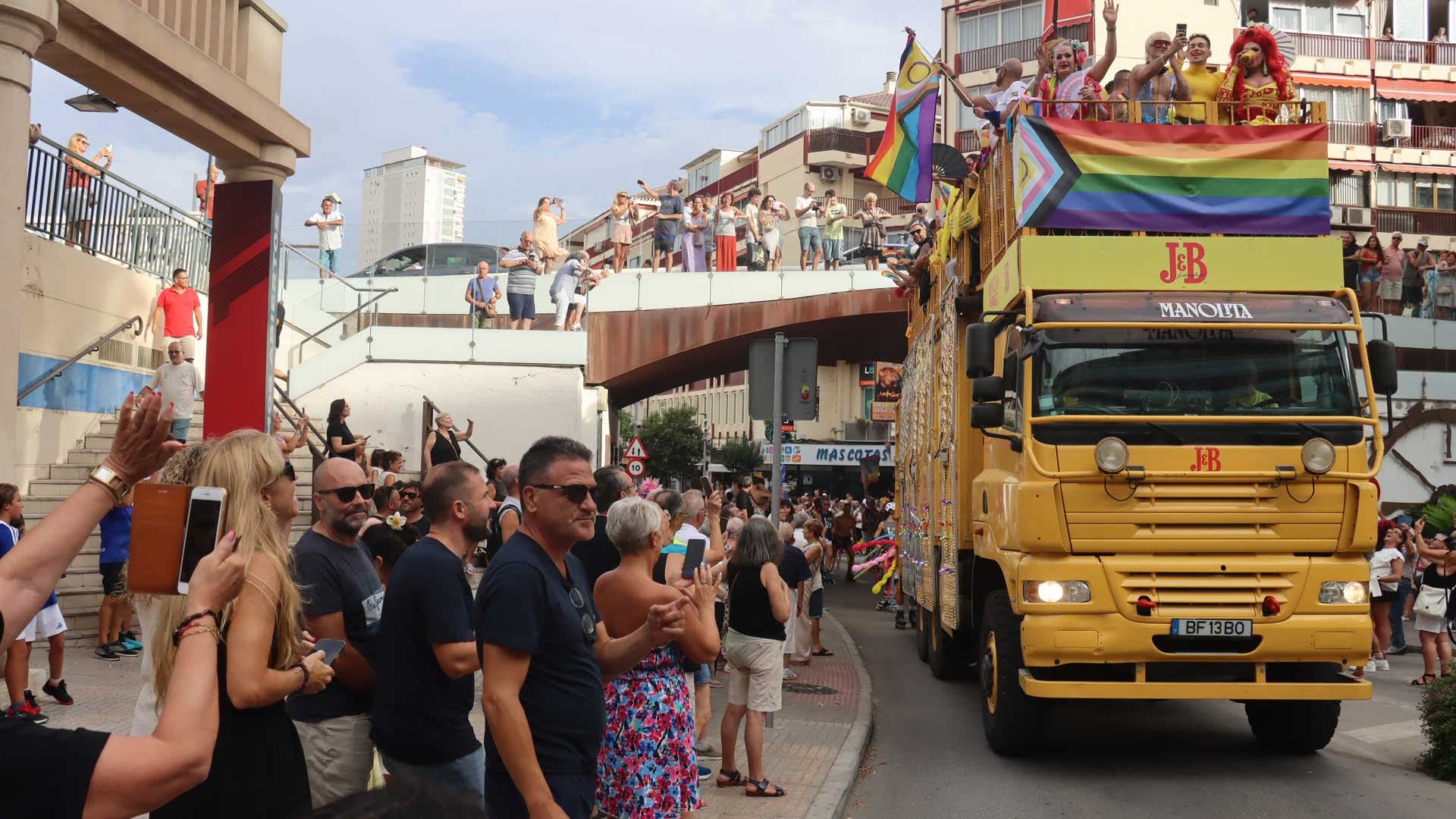 Era el acto central del Benidorm Pride, unas celebraciones durante la semana organizadas por el colectivo LGBTIQ+ y que ponen el colofón a las semanas del Orgullo más importantes de Europa. Banderas arcoíris, disfraces, carrozas, camiones y mucha gente andando y bailando han mostrado la cara más diversa y acogedora de Benidorm, un referente europeo para el turismo LGBTIQ+.