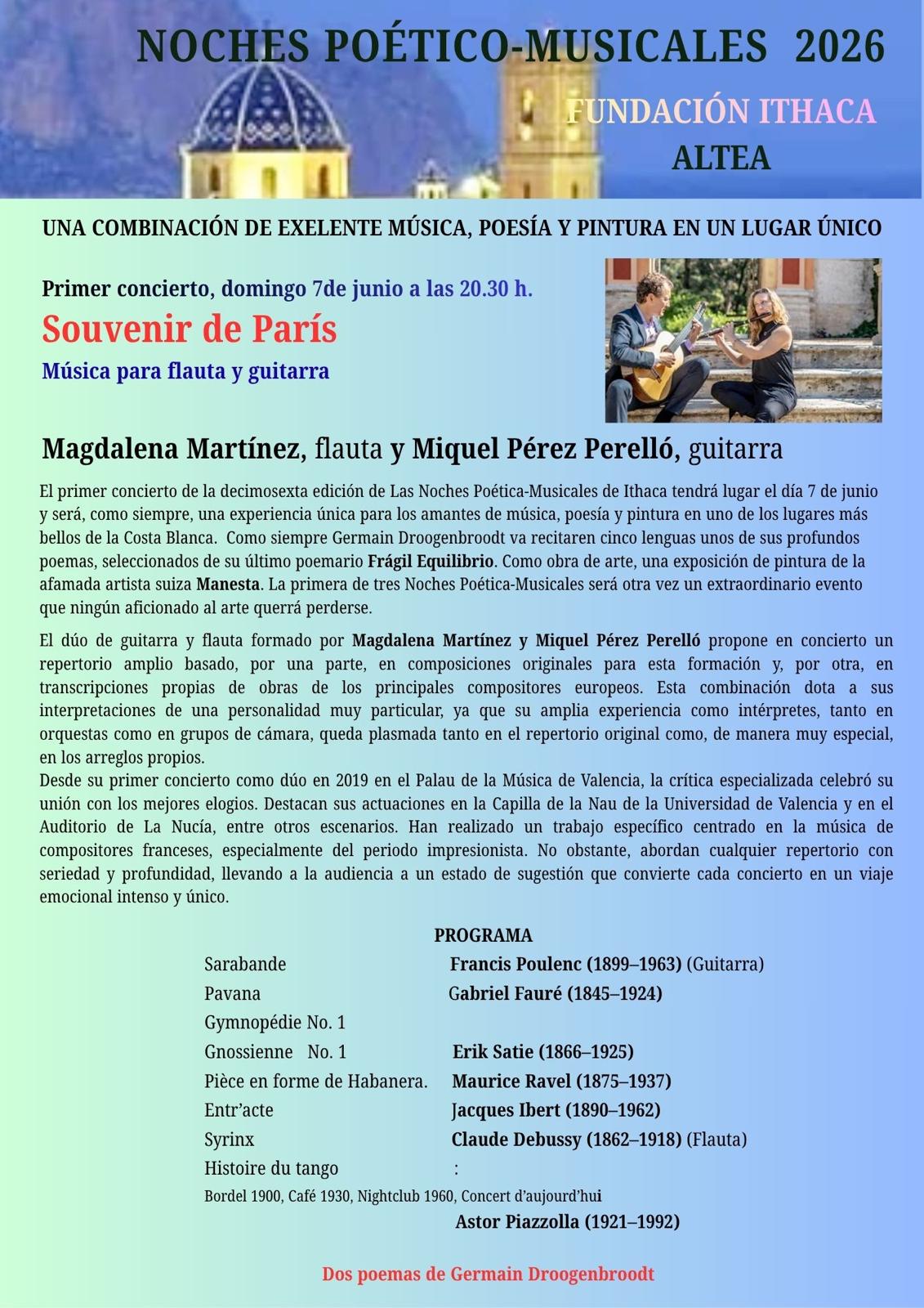 Altea inaugura las Noches Poético-Musicales 2026 con “Souvenir de París”, un espectáculo de música, poesía y arte