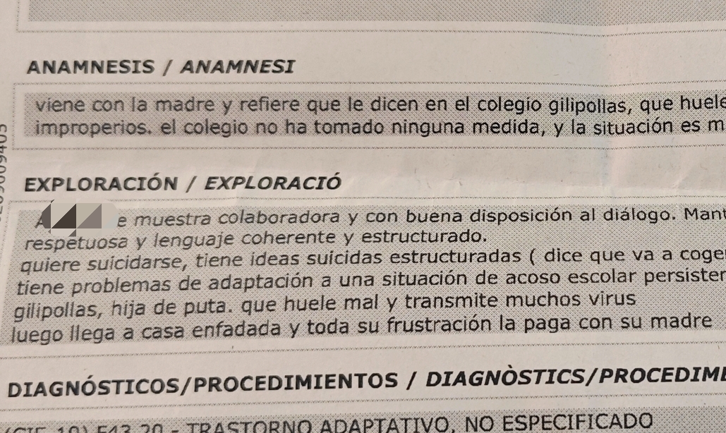 El episodio más grave tuvo lugar el pasado viernes, cuando la menor sufrió una crisis de ansiedad tras regresar del colegio. Según explica la madre, la niña reaccionó de forma impulsiva en el domicilio familiar “Se fue a la cocina, cogió un cuchillo e intentó autolesionarse. Todo viene de lo que está viviendo en el colegio”, afirma.