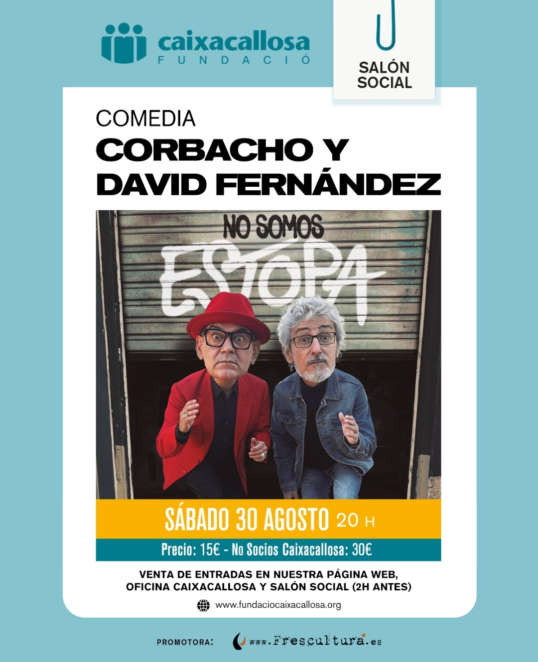 Venta de entradas on line en el siguiente enlace https://entradas.fundaciocaixacallosa.org/espectaculo/1/corbacho-y-david-fernandez-no-somos-estopa-fundacio-caixacallosa.html
