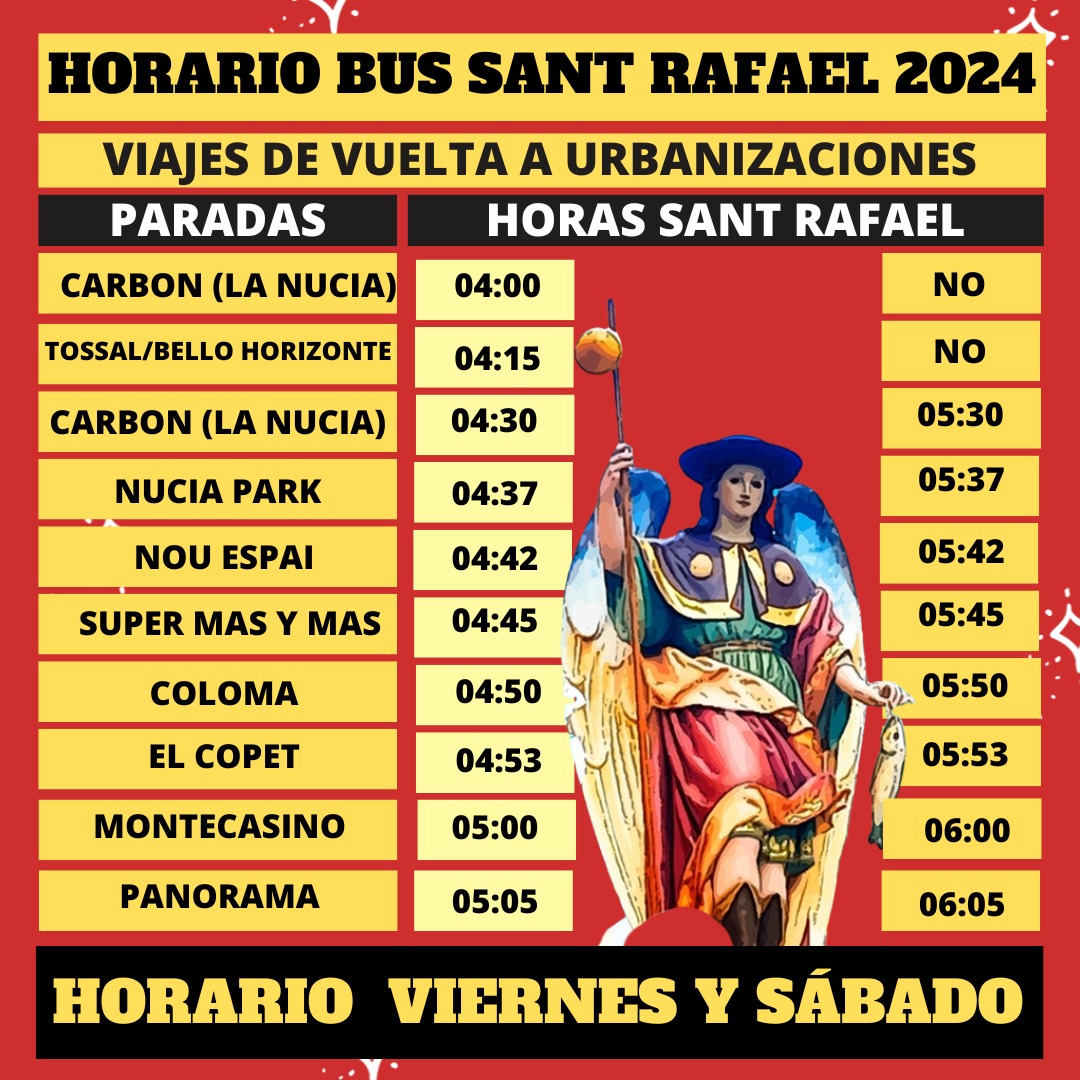 Un año más desde las concejalías de Juventud y Fiestas del Ayuntamiento de La Nucía se pone en marcha un servicio de autobús gratuito de vuelta tras las dos noches de “les Festes de Santíssim i Sant Rafel”: viernes 15 y sábado 16 de noviembre. Las salidas serán a las 4 y 5,30 de la madrugada desde el Restaurante Carbón. El “Tramús Bus” de las 4 de la madrugada parará en las paradas de Tossal y Bello Horizonte para después continuar hacia las urbanizaciones de la carretera Benidorm con paradas en: Nucia Park, Nou Espai, Super Más y Más, Coloma, Copet, Montecasino y Panorama.