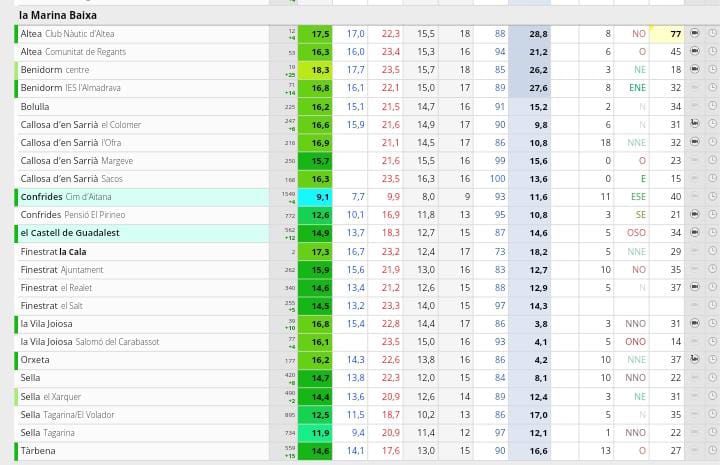 Litros por m² en la comarca de la Marina Baixa está tarde. (número sombreado en gris)
