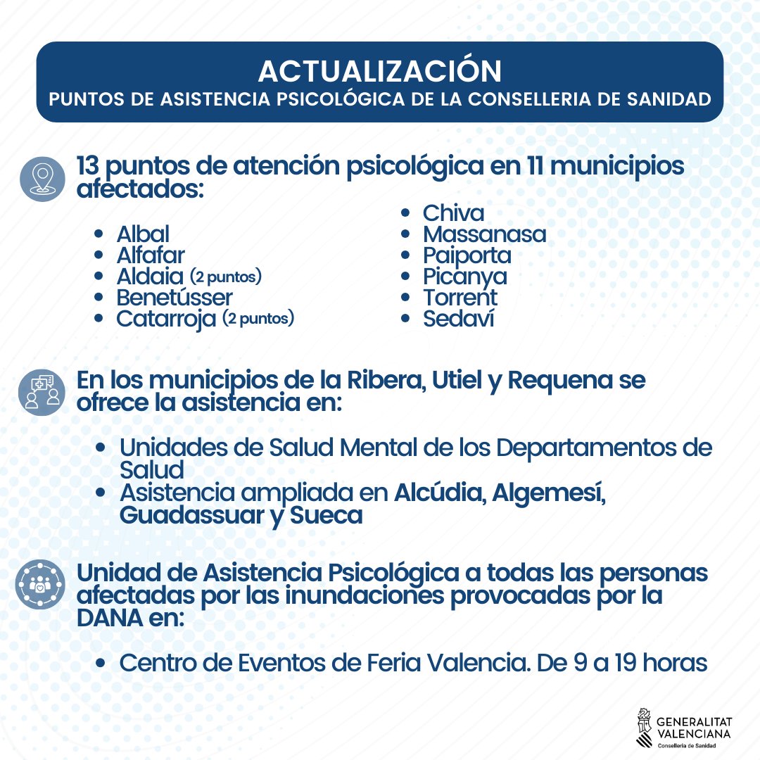 La red de atención a la salud mental de la Conselleria de Sanidad permanece plenamente activa y comprometida a seguir proporcionando el apoyo necesario para la recuperación y el bienestar de la población afectada. Durante este fin de semana se sigue prestando asistencia en los municipios de l’Horta Sud y en Feria Valencia.
