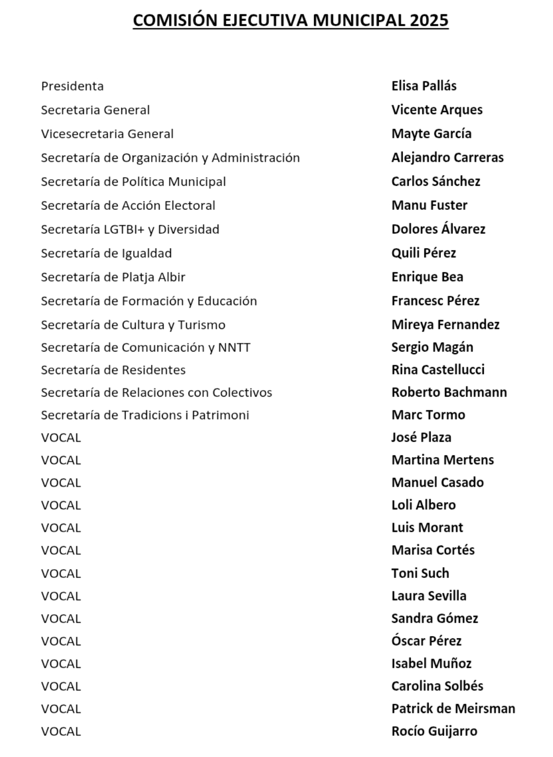 Según ha explicado Arques, “como siempre los 14 concejales restantes de l’Alfàs del Pi siguen siendo miembros natos de una ejecutiva a la que se incorporan cinco caras nuevas”. Estos nuevos integrantes son: Elisa Pallàs como presidenta; Manu Fuster en Secretaría de Acción Electoral; Quili Pérez en la Secretaría de Igualdad; en la Secretaría de Platja Albir, Enrique Bea; y Sergio Magán en la Secretaría de Comunicación y Nuevas Tecnologías.