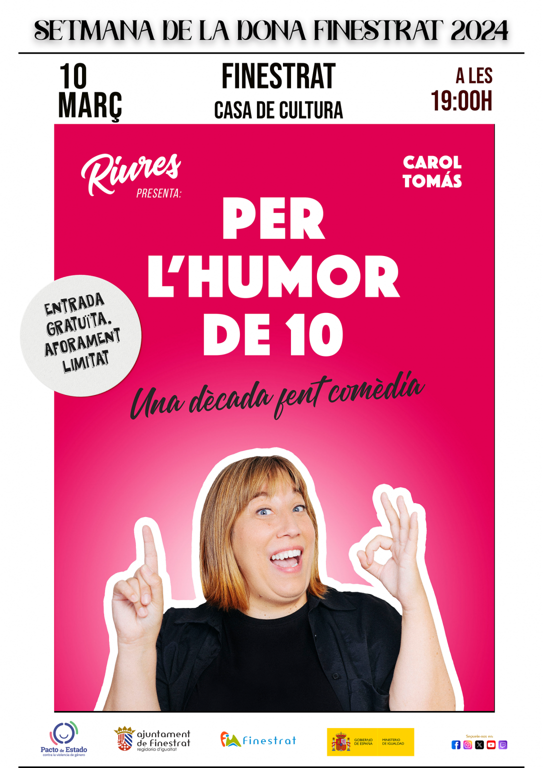 Para cerrar esta Setmana de la Dona la Casa de Cultura acoge el monólogo de Carol Tomás “Per l’humor de 10”. Será a las 19:00 horas y la entrada es gratuita, limitada al aforo del salón de actos.