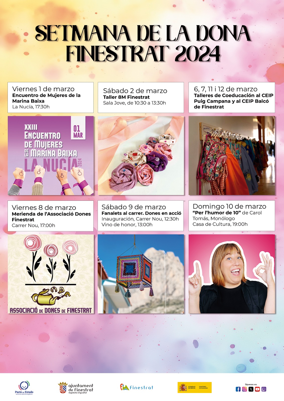 Se acerca la fecha del 8 de marzo, “Día Internacional de la Mujer” y desde la Concejalía de Igualdad han organizado un variado programa de actos titulado “Setmana de la Dona Finestrat 2024” que incluye la inauguración de los “fanalets” en el cielo del casco histórico tradicional, talleres de coeducación en los coles y el monólogo “Per l’humor de 10” de la cómica Carol Tomás, entre otros eventos